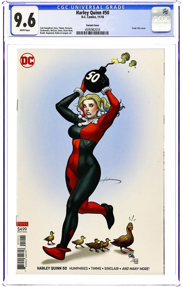 Written by Sam Humphries. Art by John Timms, Whilce Portacio, Agnes Garbowska, John McCrea, Kelley Jones, Jon Davis-Hunt, Brett Booth, Norm Rapmund, Scott Kolins, Dan Jurgens, Guillem March, Mirka Andolfo, Babs Tarr, Tom Grummett and Cam Smith. Cover by Frank Cho. In a special anniversary story, 'Harley Saves the Universe!'-no kidding! While reading a mysterious Harley Quinn comic book, H.Q. accidentally breaks all of reality. And you know the saying: if you break it, you bought it! Now it's up to Harley to travel through both time and space to fix all the continuity errors she created. Luckily, she'll have a little help, 'cuz riding shotgun is none other than special guest star Jonni DC, Continuity Cop! Good thing, too, because if Harley fails, it means her own mom will be lost forever. Gulp! That doesn't sound very funny! 48 pages, full color. Rated T+ Cover price $4.99.