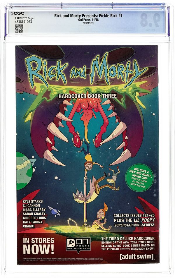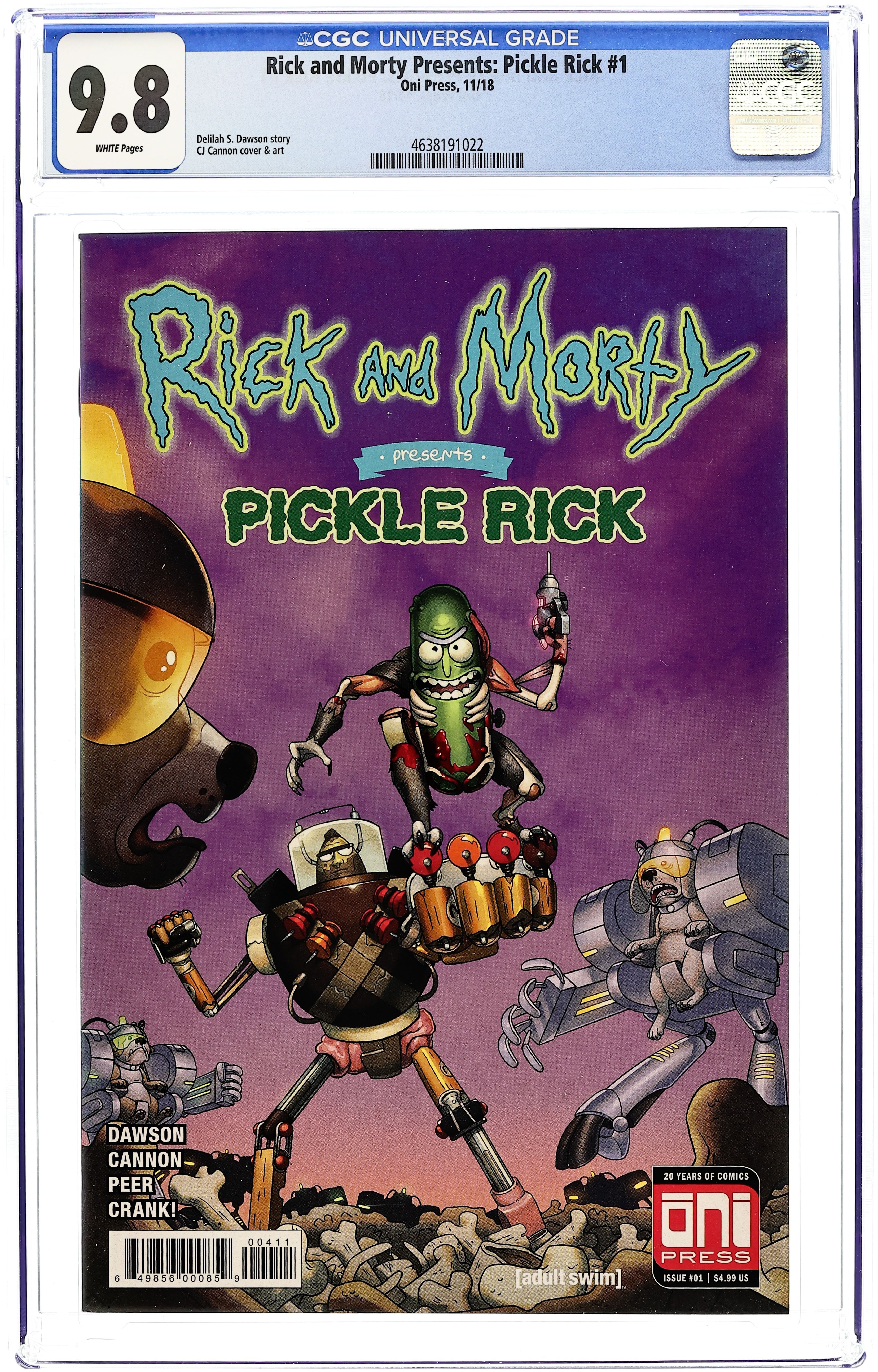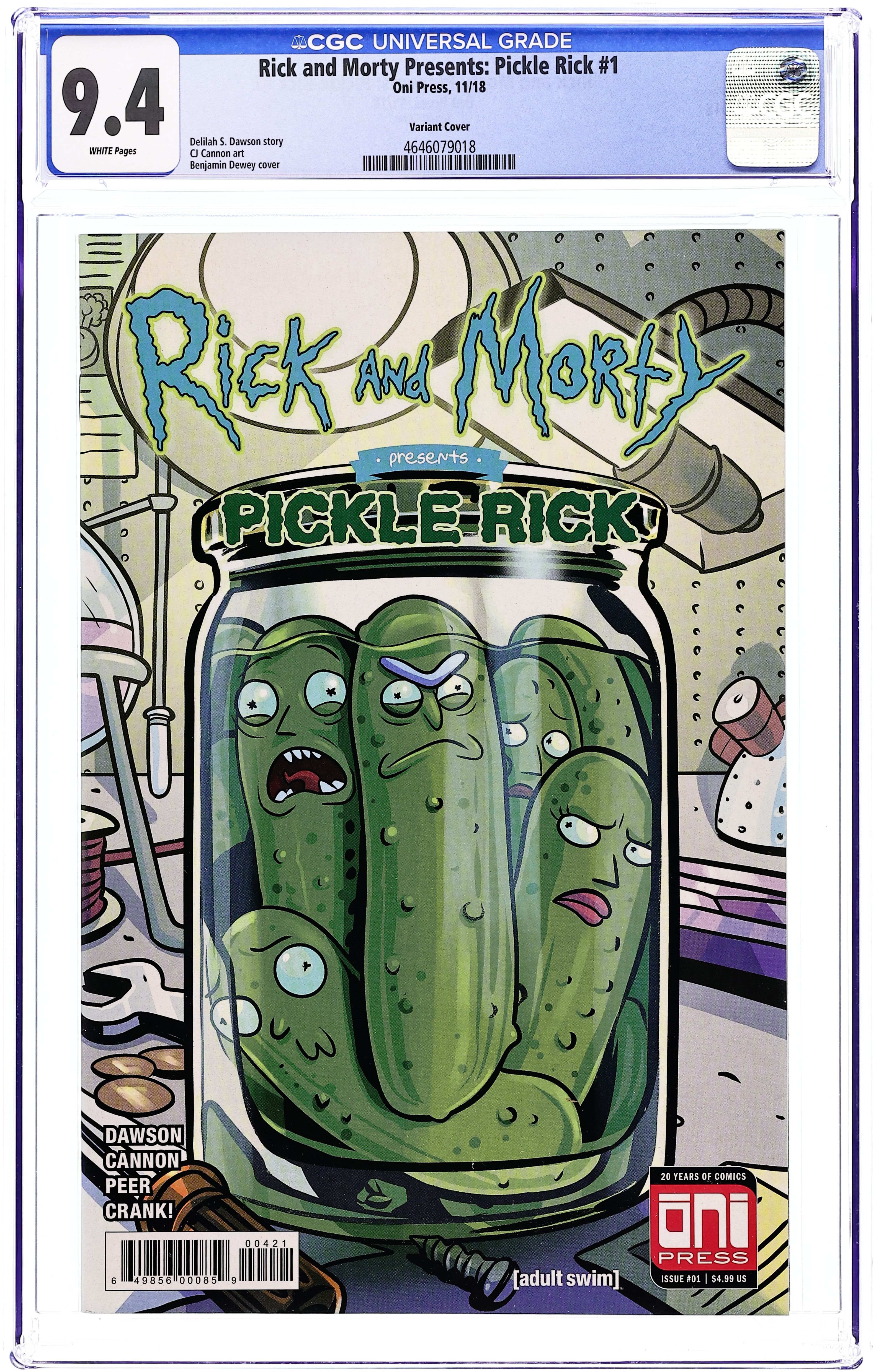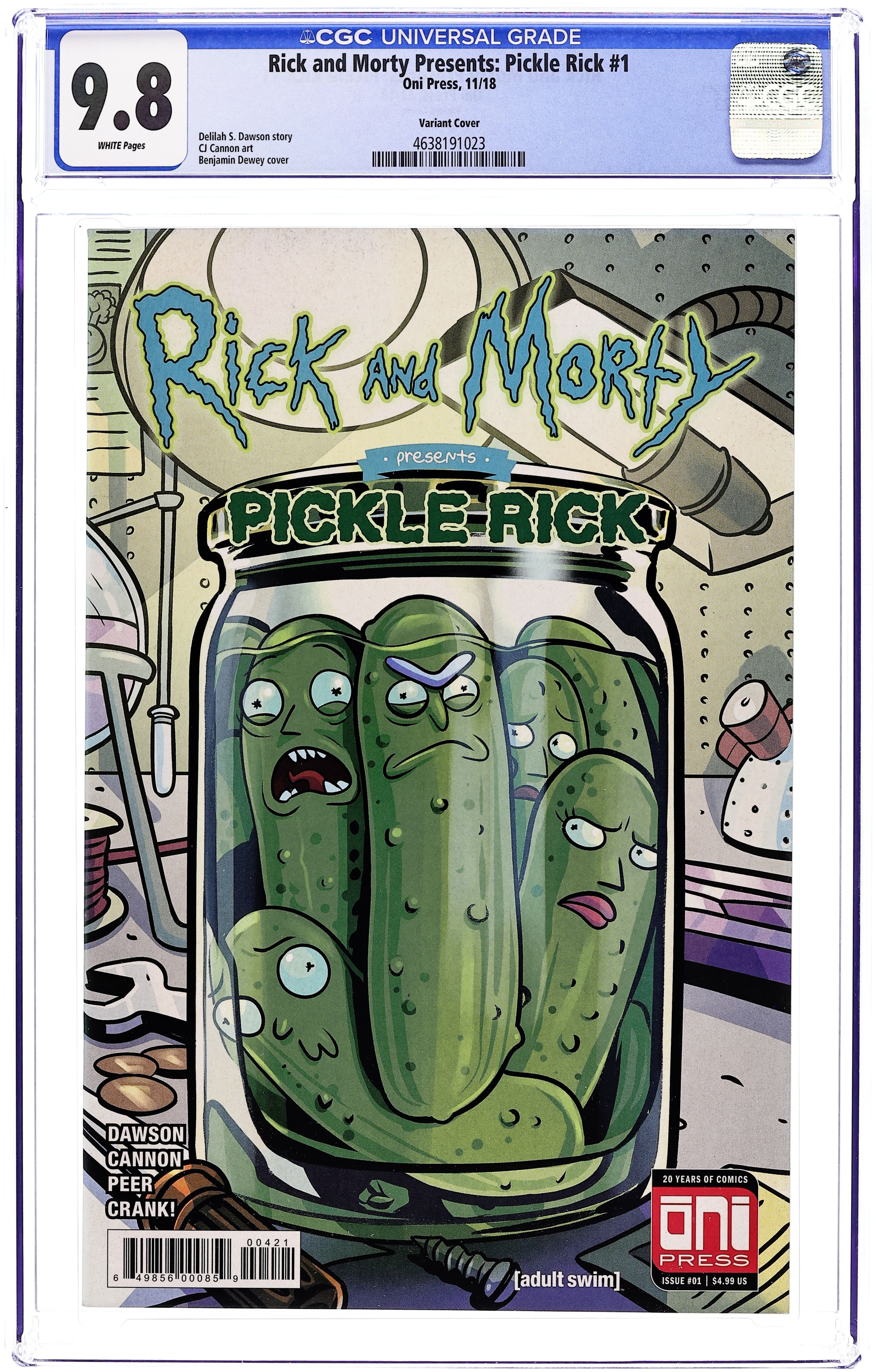 Written by Delilah Dawson. Art by CJ Cannon and Nick Filardi. Cover by CJ Cannon. The biggest pickle-sized character in pop culture comes to comics! In this reimagined version, written by Delilah S. Dawson (Star Wars) and with art from series artists CJ Cannon and Brittany Peer, Rick gets out of some much-needed family therapy time by inventing a fruit gun, which he uses on himself, and things go...poorly. Yes, cucumbers are fruits! Plus, Jaguar's back and he's on a mission to save his daughter. 36 pages, full color. Cover price $4.99.