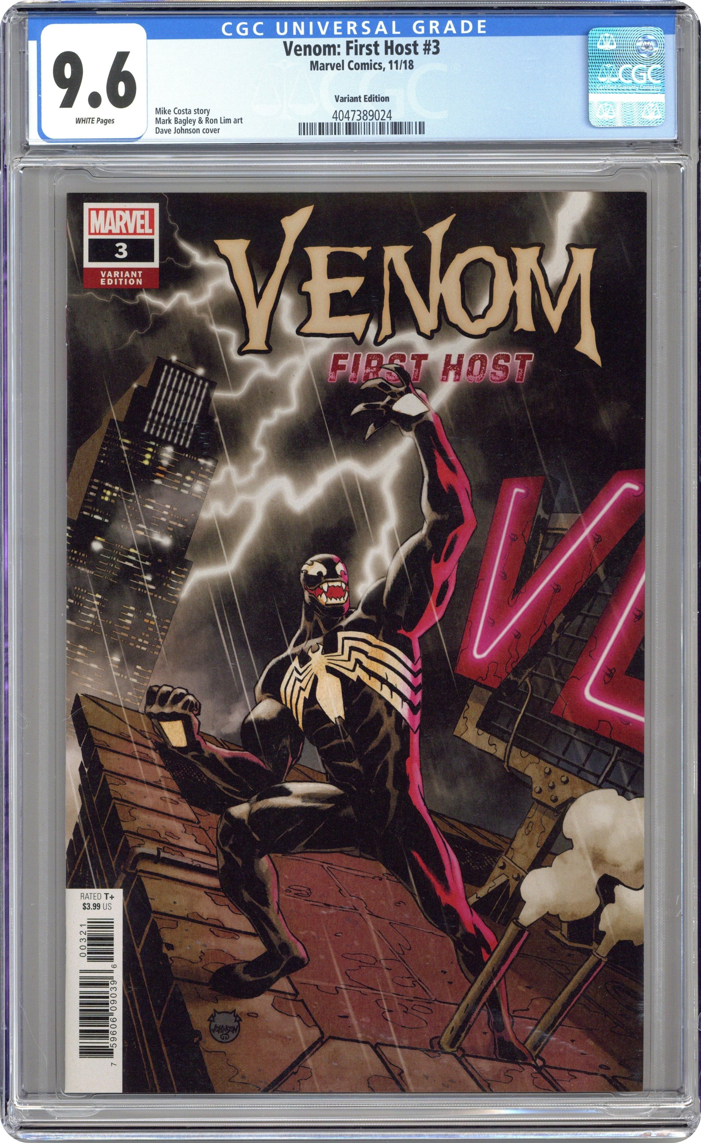 Written by Mike Costa. Art by Mark Bagley and Ron Lim. Cover by Dave Johnson. After the extraterrestrial ambush of last issue, the Venom symbiote will have to choose between allowing its newborn offspring to die…or separate from Eddie Brock! 28 pages, full color. Rated T+ Cover price $3.99.