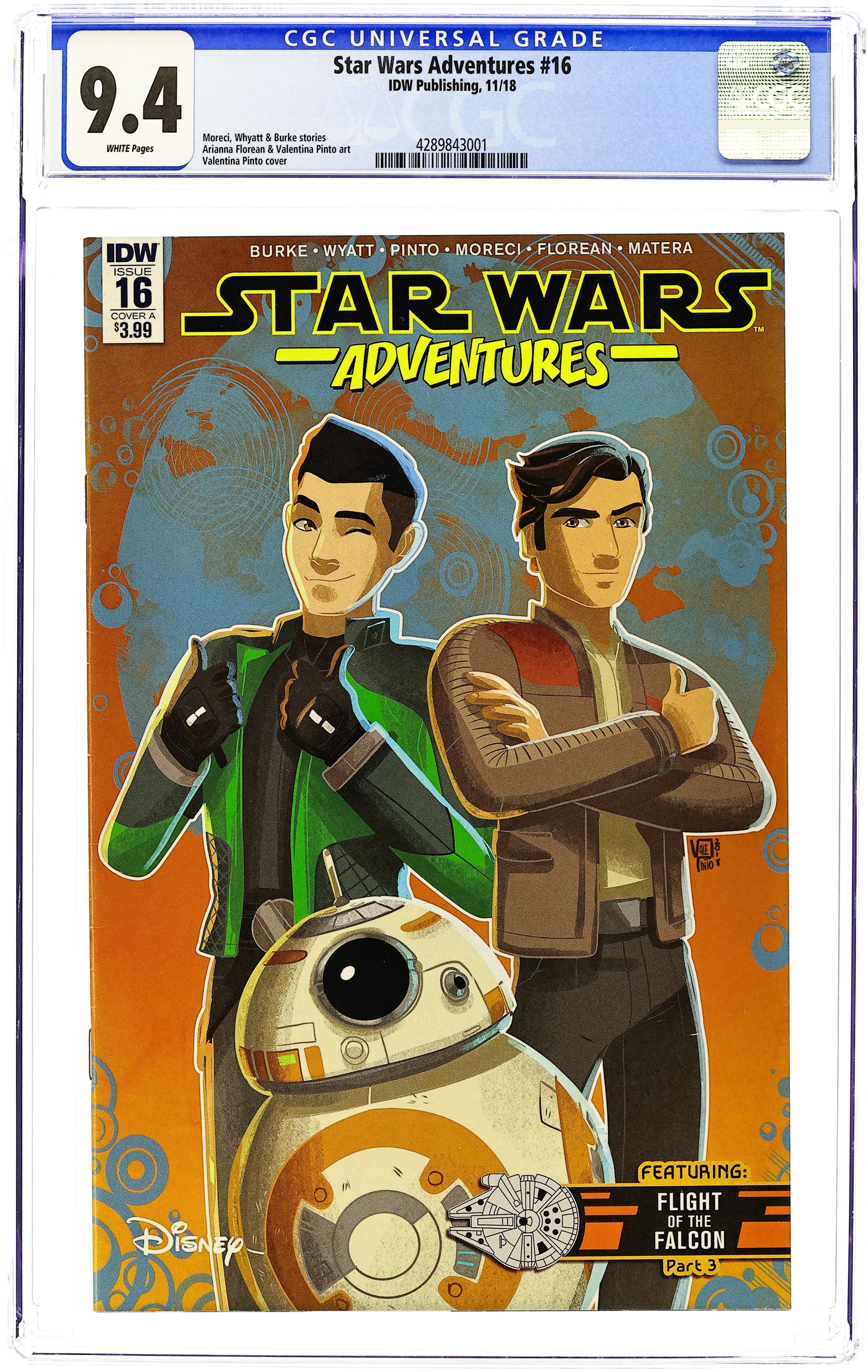 Cover by Valentina Pinto. Written by Chris "Doc" Wyatt, Kevin Burke and Michael Moreci. Art by Valentina Pinto and Arianna Florean. Welcome to the Resistance! Star Wars Resistance is an exciting new animated series coming to the Disney Channel this fall, and making its Star Wars Adventures debut in this very issue! In the time before The Force Awakens, this all-new adventure follows the fledgling Resistance as it begins to realize the growing threat of the First Order in "All Aces Battle Royale" by Chris "Doc" Wyatt, Kevin Burke and Valentina Pinto. Written by Resistance show writers Wyatt and Burke! Plus: Lando Calrissian and Nien Nunb in "Flight of the Falcon: Part 3: Home Again" by Michael Moreci and Arianna Florean. 28 pages, full color. Cover price $3.99.