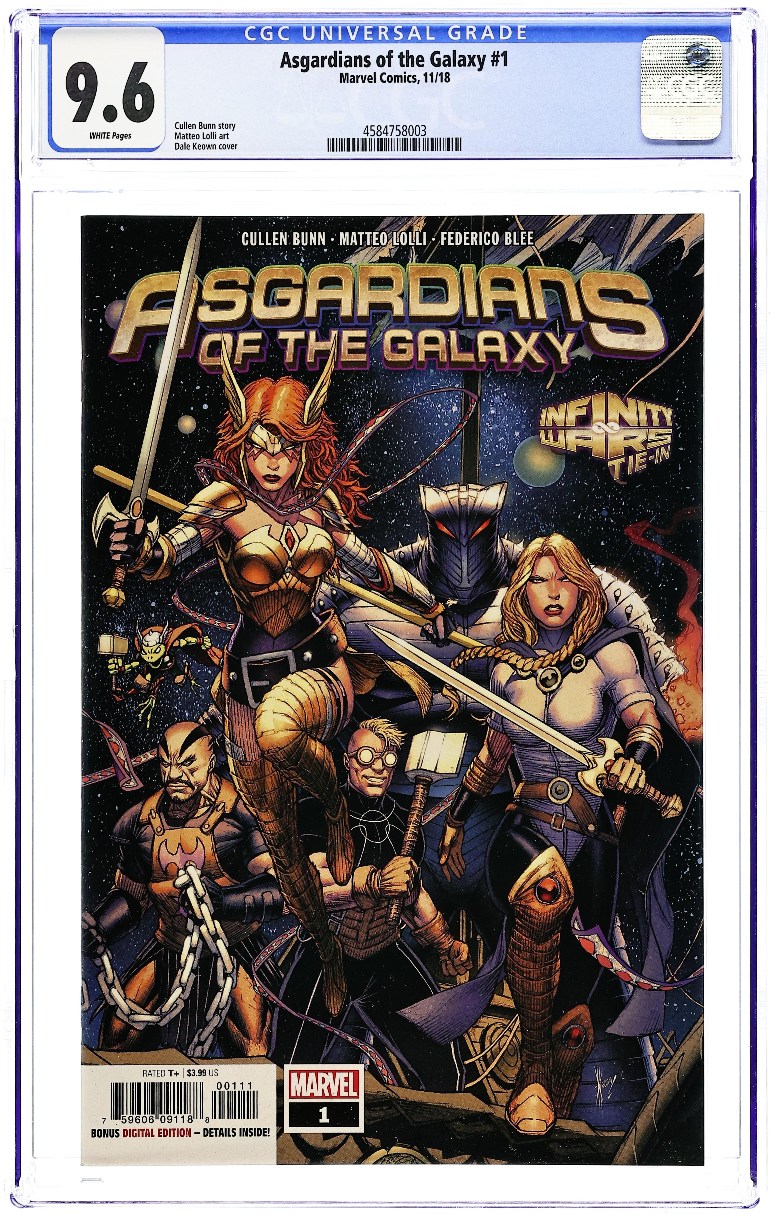 Written by Cullen Bunn. Art by Matteo Lolli. Cover by Dale Keown. Spinning out of the events of INFINITY WARS comes an epic space opera from DEADPOOL veterans Cullen Bunn and Matteo Lolli! Angela, the not-so-beloved half-sister of Thor. The hotheaded Valkyrie - and the human who shares her form, Annabelle Riggs. Skurge the Executioner, freshly returned from Hel. Throg, the mightiest frog of thunder. Kevin Masterson, the boy who took his father's mace to become the hero Thunderstrike. And the Destroyer, the Asgardian armor built to take down Celestials - its wielder unknown. The events of INFINITY WARS set NEBULA off on a quest to rule the galaxy - wielding an Asgardian weapon even Thor would fear - and it's up to this team of gods, assassins, frogs and heroes to stop her. 32 pages, full color. Rated T+ Cover price $3.99.