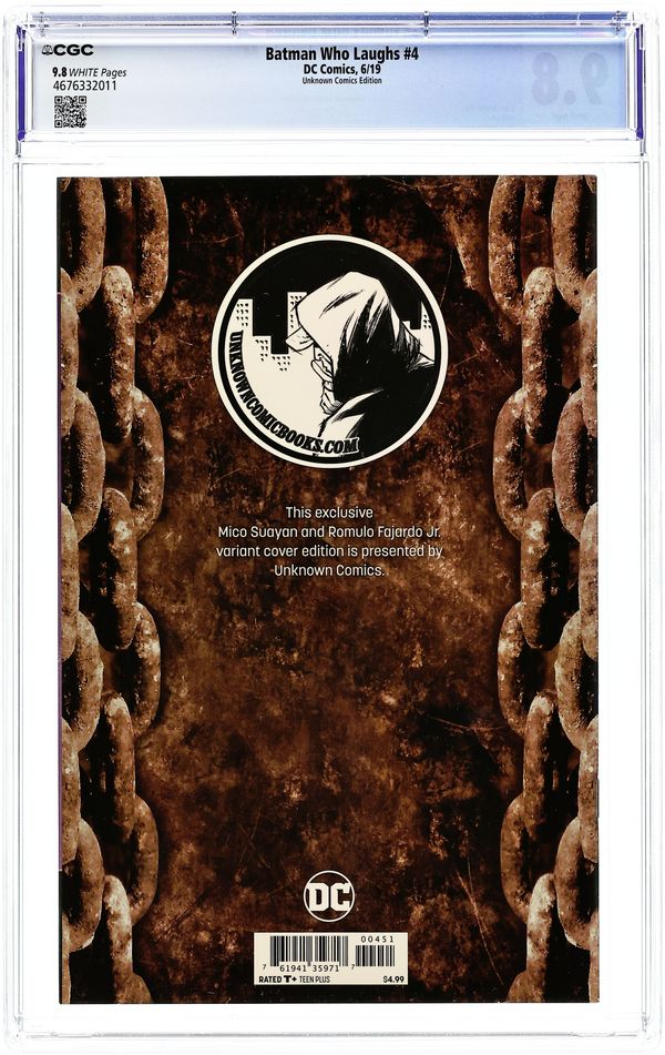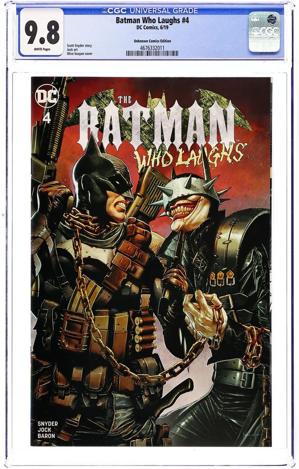 Unknown Comics Exclusive Cover by Mico Suayan. Written by Scott Snyder. Art by Jock. Batman is on a desperate hunt through Gotham City, tracking down the dark version of himself known as the Grim Knight. But the serum Batman's been self-administering has started to transform his mind, making him into something much darker...something amoral…something like the Batman Who Laughs-and he's starting to lose his grip on reality. Toeing the line between vengeance and justice, Batman must struggle to keep his moral code as the Grim Knight gains control of the Batcave, sending all of his vehicles and weapons on a collision course with Gotham City. The Grim Knight, the Batman Who Laughs, even allies like Jim Gordon and his son force Batman to pull the trigger…and activate the Last Laugh. Will Batman be the savior of Gotham City once more? Or is he the kill shot? 32 pages, full color. Rated T+