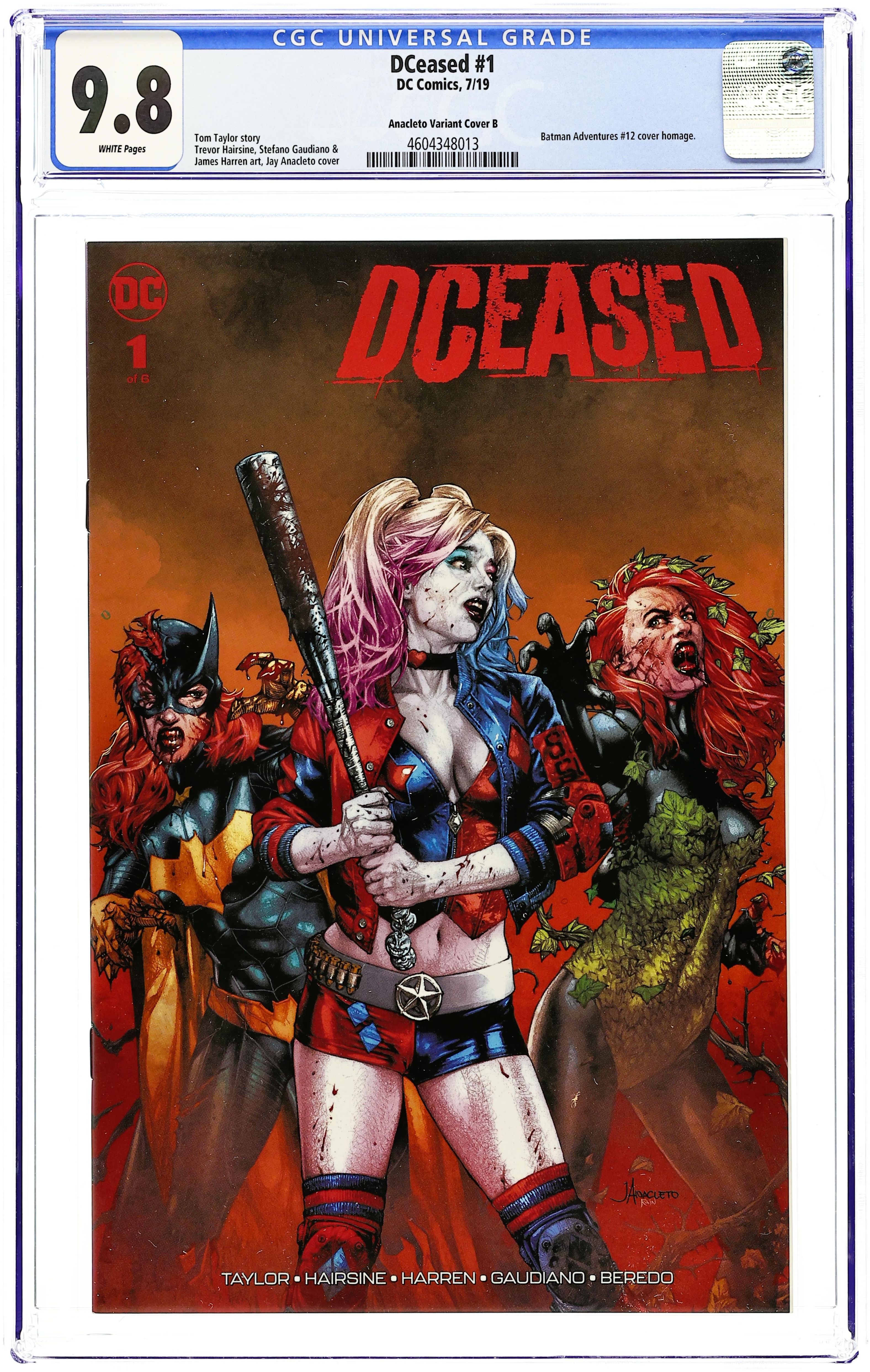 Comic Mint Edition A exclusive variant by Shannon Maer. Written by Tom Taylor. Art by Trevor Hairsine, Stefano Gaudiano, and James Harren.. 'I looked, and there before me was a pale horse! Its rider was Death, and Hades was following close behind him.'-Revelation 6:8 A mysterious techno-virus has been released on Earth, infecting 600 million people and turning them instantly into violent, monstrous engines of destruction. The heroes of the DCU are caught completely unprepared for a pandemic of this magnitude and struggle to save their loved ones first…but what happens to the World's Greatest Heroes if the world ends? New York Times best-selling writer Tom Taylor (INJUSTICE) returns with a terrifying new tale and is joined by artists Trevor Hairsine (LEGENDS OF THE DARK KNIGHT) and Stefano Gaudiano (The Walking Dead). 32 pages, full color. Rated T+