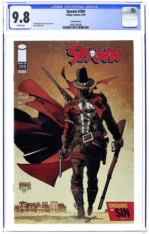 Consequence of Sin: Part 2 - Written by Todd McFarlane. Art by Ken Lashley. Cover by Todd McFarlane. New heroes! New villains! New war! The MYSTERIOUS and DANGEROUS army of Spawns continues to grow. First She-Spawn and Reaper! Then Medieval Spawn! Now Gunslinger Spawn has made his presence known. But who is a hero and who is a villain? And is Al Simmons strong enough to control them all? Maybe his new armor will help! TODD McFARLANE and KEN LASHLEY continue their epic tale! 28 pages, full color. Cover price $2.99.
