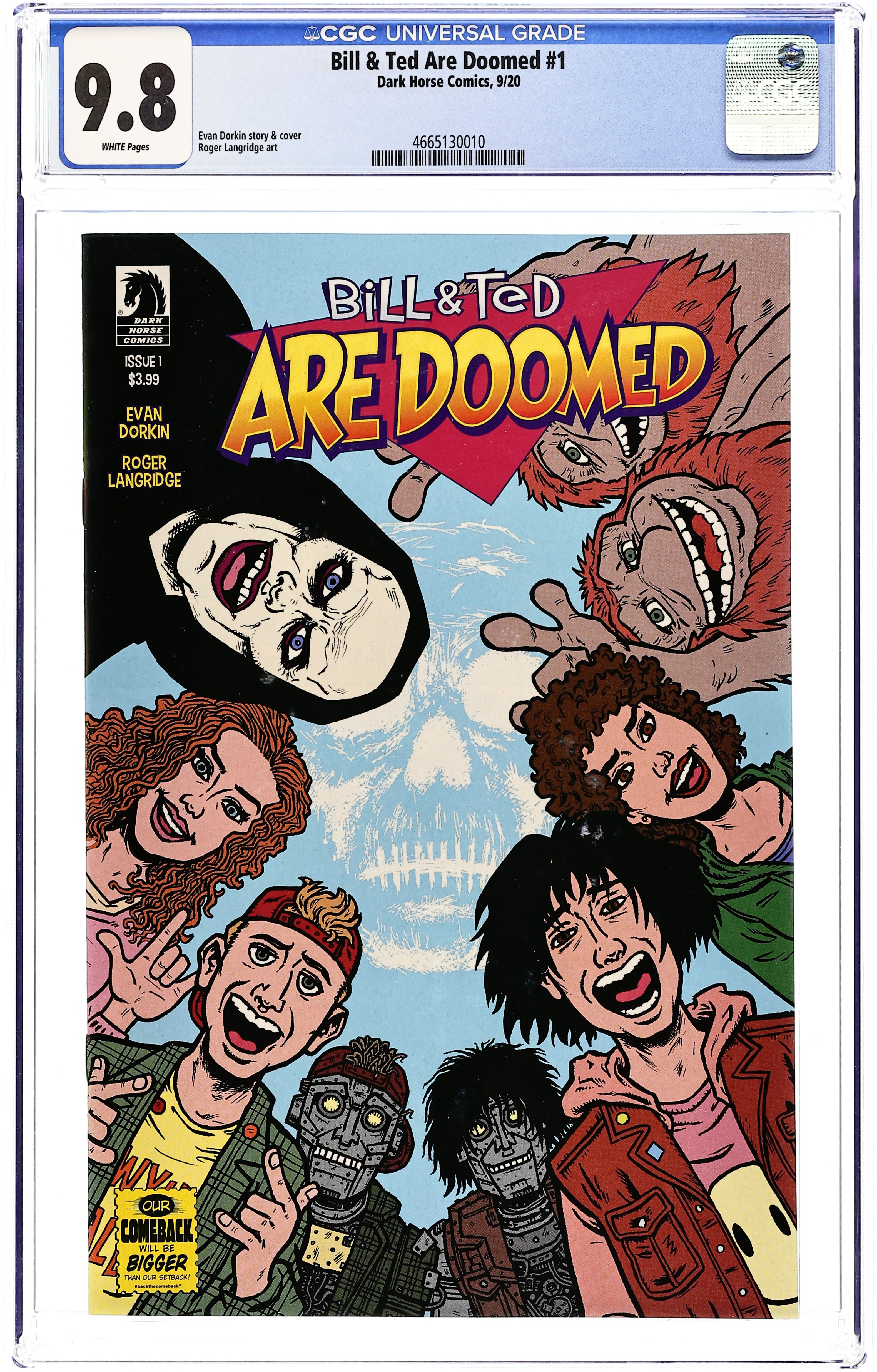Written by Evan Dorkin. Art by Roger Langridge. Cover by Evan Dorkin. After defeating the evil dictator De Nomolos in Bogus Journey in 1995, things aren't looking as excellent as they should for either Bill and Ted or Wyld Stallyns. There's tension in the band and worry at home. Bill and Ted's obsessiveness with writing the one song to bring peace to the world is affecting their playing and their relationships with their families. The band is losing favor with fans and the future isn't shaping up as they were all led to believe it would from past (and future) events. Desperate for a solution Bill and Ted burst in to announce their great idea to revive the band's fortunes: A world tour to spread the love-and the rock, and the love of the rock-to the world. 28 pages, full color. Cover price $3.99.