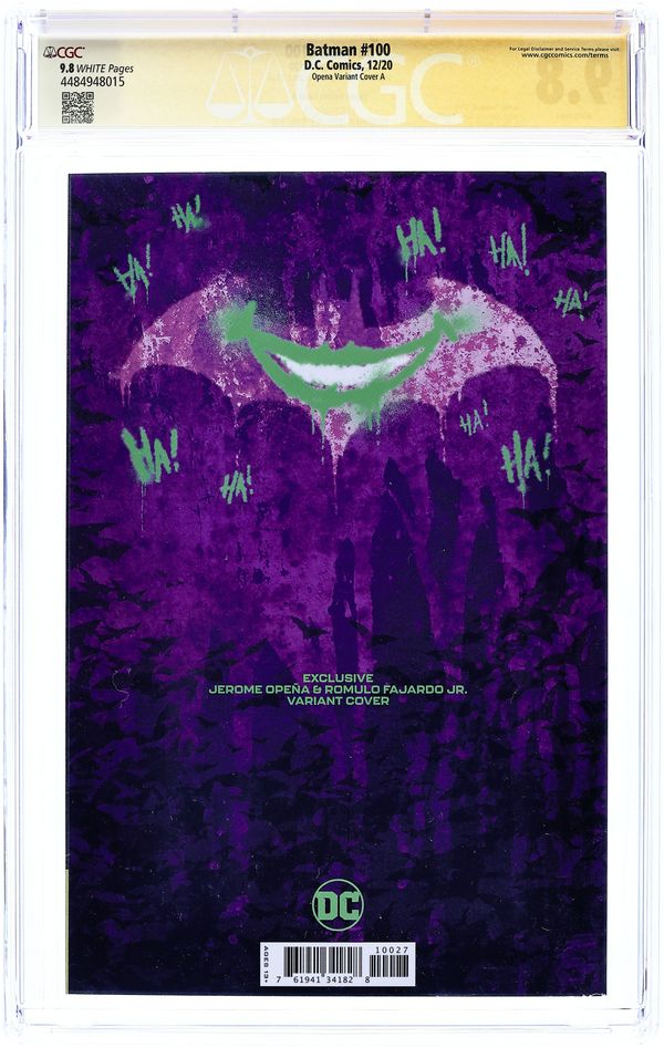 Wraparound Cover by Jorge Jimenez. The Joker War: Part 6 of 6. Written by James Tynion IV. Art by Jorge Jimenez, Carlo Pagulayan, Guillem March and Danny Miki. The Joker War comes to a city-shattering conclusion as Batman battles The Joker in a brutal, no-holds-barred duel! This is a fight 80 years in the making, and its outcome won't just change Batman's life -- it will change Gotham City for years to come! Plus, catch the first glimpse of the new villain known as Ghost-Maker! It's all in "The Joker War Finale" by James Tynion IV and Jorge Jimenez. And after the senses-shattering conclusion of The Joker War come a pair of back-up stories that will chart what's to come in this series and in Gotham City! Don't miss the first showdown between Batman and Clownhunter in "Intervention" by Tynion IV, Carlo Pagulayan and Danny Miki, plus "Dead Ringer" by Tynion IV and Guillem March, which leads into Punchline Special (2020 DC) #1. 56 pages, full color. Ages 13+ Cover price $7.99.