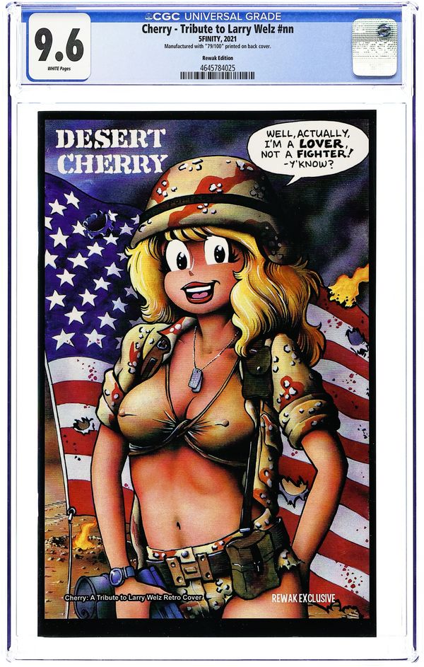 Starts Dec 15 Rewak Exclusive "Desert Cherry" Edition Variant Cover by Larry Welz - limited to 100 copies. Larry Welz is an underground comix pioneer. His character, Cherry, is beloved all around the world. Having made her debut in 1982, she has become the ultimate sexy, adventurous girl next door! Cherry has been featured on trading cards, apparel, household items, and of course, in her own ongoing comic series. Comic book luminaries such as Neil Gaiman, Mark Bode, Reed Waller, and Larry Todd have all worked on Cherry. This authorized tribute to Mr. Welz features many variant covers and pin-ups, all brand new, being published for the first time. Featured artists include, but is not limited to, Dean Yeagle, George Webber, Scott Underwood, Rusty Gilligan, Stef Wilson, Ana Sanchez, Roger Andrews, Boo, Pasquale Qualano, Jerry Carr, Glen Fernandez, Tim Seeley, Danielle Gransaull, Ben Dunn, John Seabury, Mark Bode, Ashlianna Felix, Jamie Joslyn, Reed Waller, Sammo Filipo, and D Lo!This pin-up comic is 32 pages and in full color (this includes the four extra pages from the stretch goal reward). The covers will be serial numbered on the back cover based on the number of pledges made (unless limited), respectively, plus a small over-run. - From official Kickstarter page. 32 pages, full color.