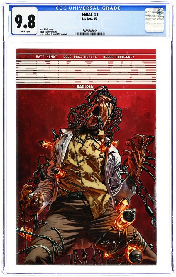 Story by Matt Kindt. Art by Doug Braithwaite and Diego Rodriguez. Cover by Lewis LaRosa and Laura Martin. Back cover by Matt Kindt. Seventy-seven years ago, the United States unlocked the key to defeating the Axis powers, but, in their desperation to end the war, created a far more powerful threat: ENIAC (Electronic Numerator Integrator and Computer), the worlds first supercomputer. ENIAC's calculations proved vital to turning the tide against Germany and Japan – until it ordered the second atomic bomb to be dropped on Nagasaki without any human order or approval. America had inadvertently created the first artificial intelligence without ever realizing the full extent of its abilities...or its ambitions. For the more than 50 years that followed, ENIAC manipulated global affairs from the shadows, waging a cold war that pitted spy against spy, nation against nation...until it went dark and disappeared from view. Now, years later, an encrypted countdown has just been detected in Earth's satellite network and mankind only has three days left before ENIAC executes its endgame. With few options and even less time, the Secretary of Defense has just given two covert operatives the most important mission in human history: kill ENIAC…before it kills us. 52 pages, PC/PB&W. Cover price $3.99.