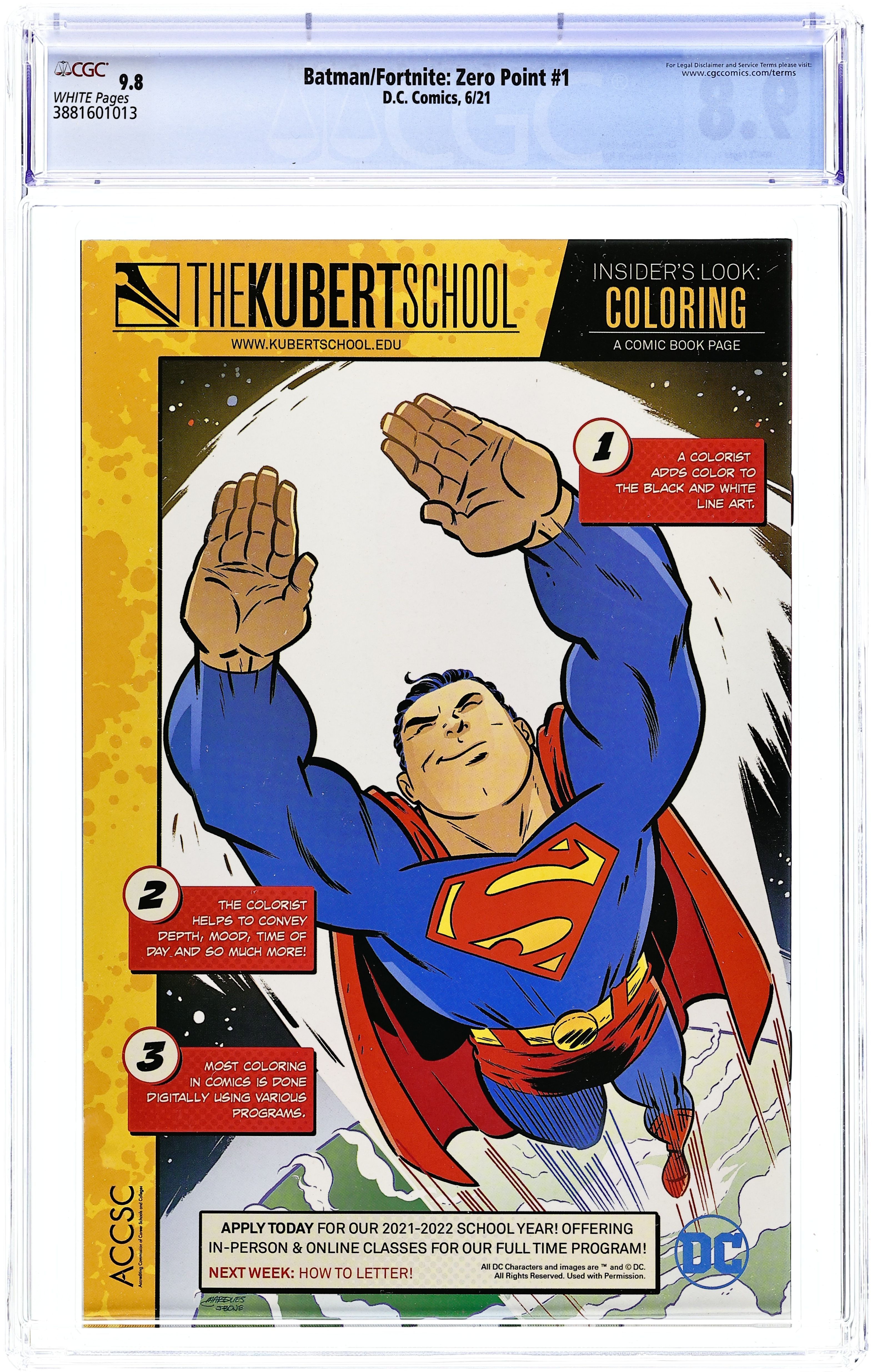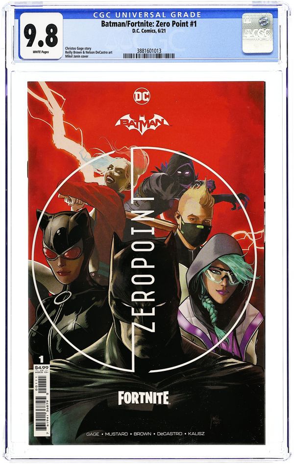 Written by Christos Gage and Donald Mustard. Art by Reilly Brown and Nelson Faro DeCastro. Cover by Mikel Janín. A crack splits the sky above Gotham City... a tear in reality itself. This rift pulls the Dark Knight into a bizarre and unfamiliar world, with no memory of who he is or where he came from... Batman has been drawn into Fortnite! As he fights to recall his past and escape an endless loop of chaos and struggle, he'll come face-to-face with the likes of Renegade Raider, Fishstick, Bandolier, and more. While the world's greatest detective strives to make sense of this strange new world, he'll uncover the shocking truth about the Island, what lies beyond the Loop, and how everything is connected to the mysterious Zero Point.Batman/Fortnite: Zero Point uncovers secrets never before revealed in game or anywhere else! Every fan of Batman, Fortnite, stunning art and edge-of-your-seat excitement won't want to miss the Caped Crusader facing off against Fortnite champions on the Island, in a desperate attempt to save not only himself, but other familiar faces from the DCU...and perhaps the Multiverse itself! This will be a bi-weekly miniseries.Each print issue of Batman/Fortnite: Zero Point will include a redeemable code for bonus DC-themed Fortnite digital items, inspired by the events in the comic, starting with the new Rebirth Harley Quinn Outfit. As a bonus item, fans who redeem all six codes will unlock a new Armored Batman Zero Outfit. 32 pages, full color. Rated T+ Cover price $4.99.