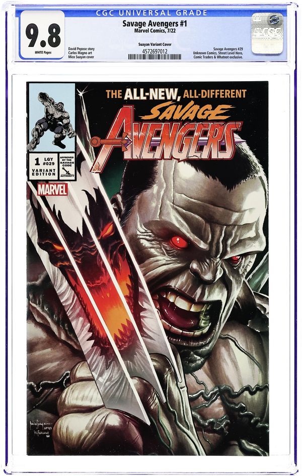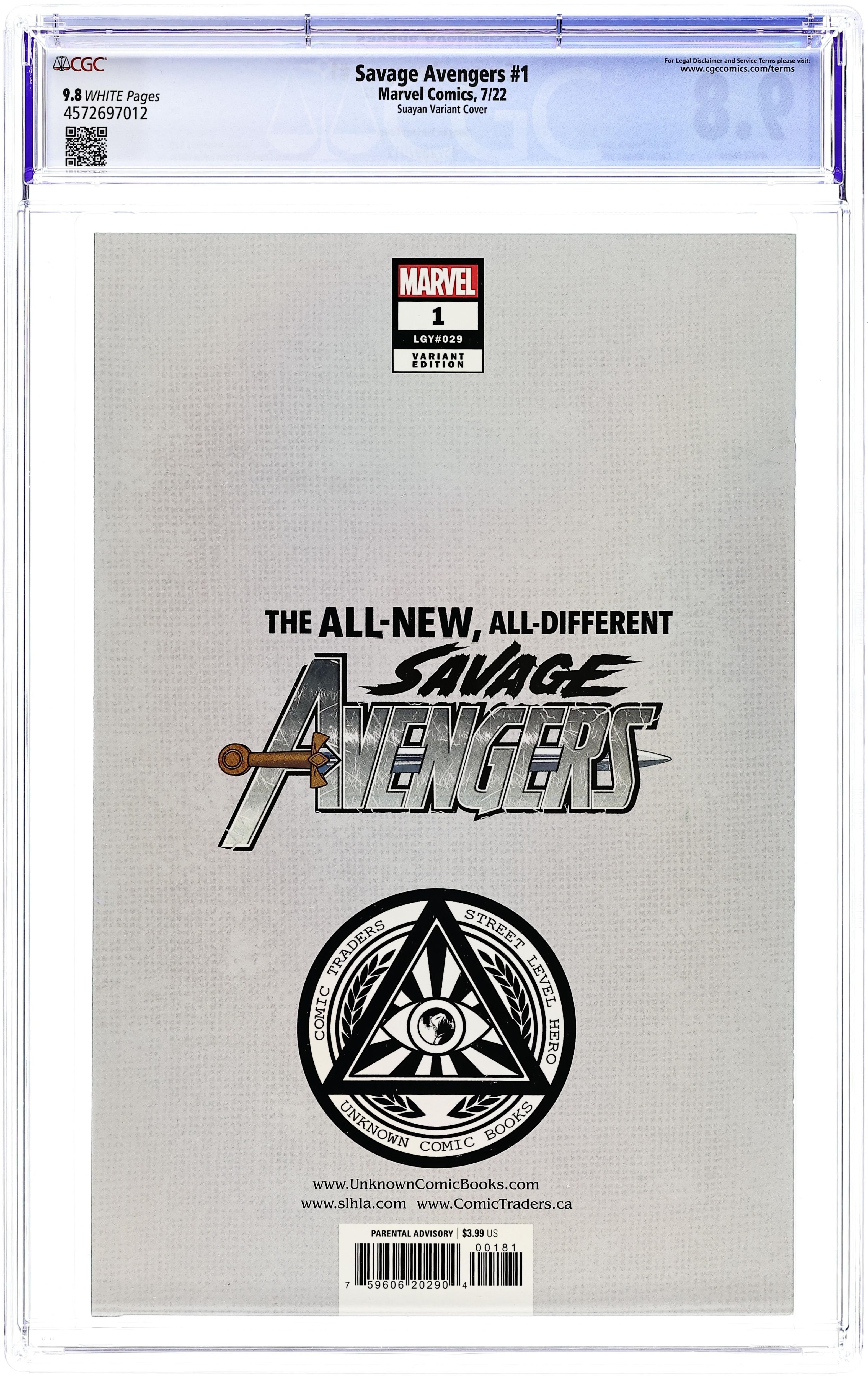 Comics Illuminati (Unknown Comics, Comic Traders, and Street Level Hero) Exclusive Variant Cover by Mico Suayan. Written by David Pepose. Art by Carlos Magno. AN ALL-NEW, ALL-DIFFERENT, ALL-DANGEROUS TEAM ASSEMBLES! Since his exile from the Hyborian Age, Conan the Barbarian has conquered the most dangerous foes the modern Marvel Universe has to offer - but what happens when this hard-edged Cimmerian finds himself on the run from the cybernetic soldier of the future known as Deathlok? Outgunned and outmatched, Conan must turn to an unlikely group of loners, berserkers and killers if he hopes to survive the night - but can these Savage Avengers defy Deathlok's murderous manhunt, or will they become the next targets in the crosshairs of tomorrow? Don't miss out on a bold new beginning for Marvel's most savage super heroes, as Ringo Award-winning writer David Pepose (Spencer & Locke, Scout's Honor) and superstar artist Carlos Magno (KANG THE CONQUEROR, RoboCop: Dead or Alive) introduce a sensational new lineup that will resonate across every era of the House of Ideas! 28 pages, full color. Parental Advisory Cover price $3.99.