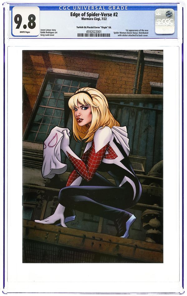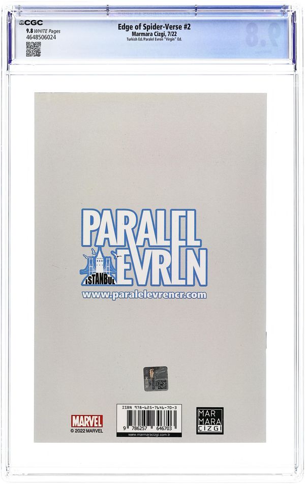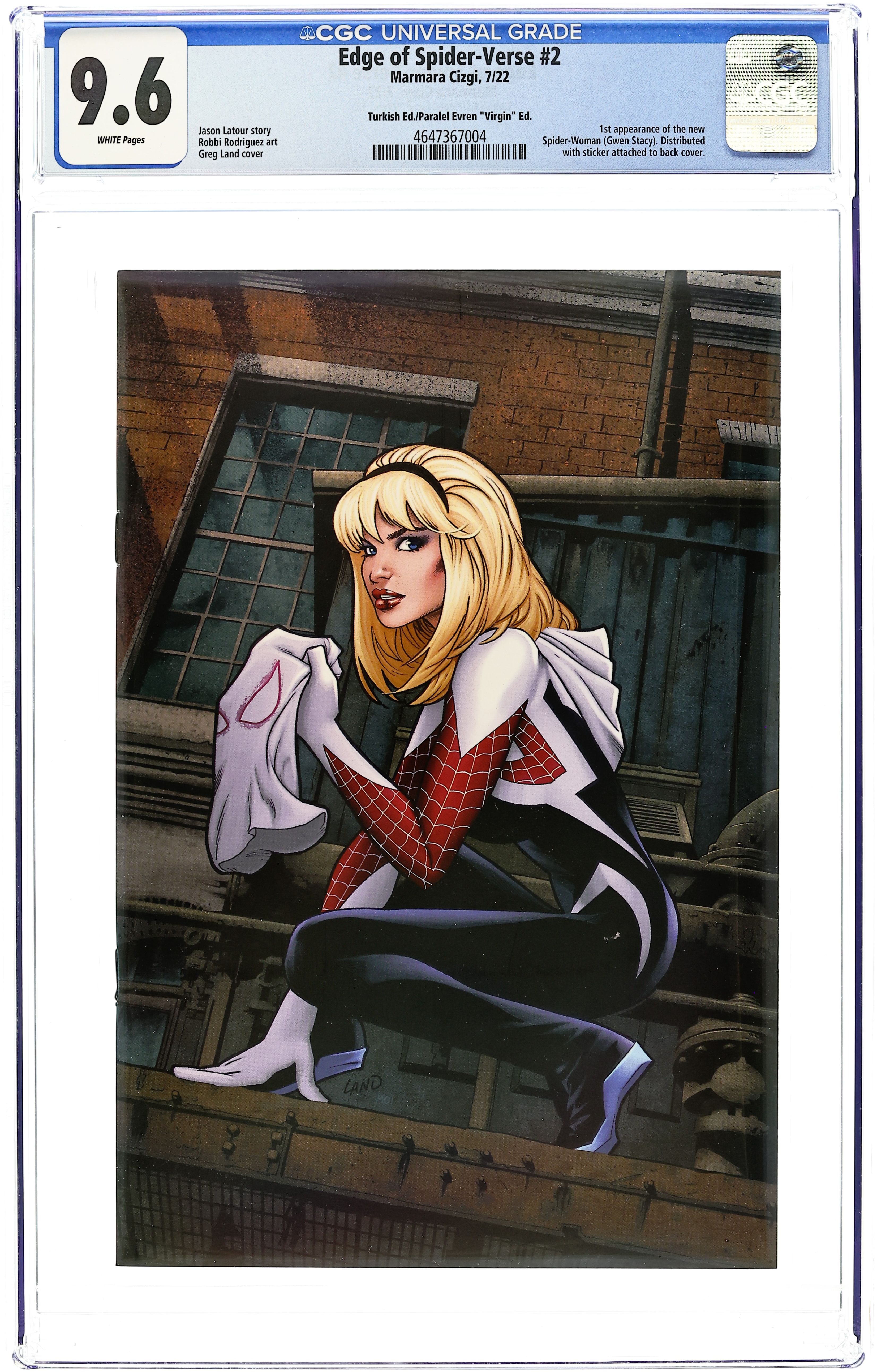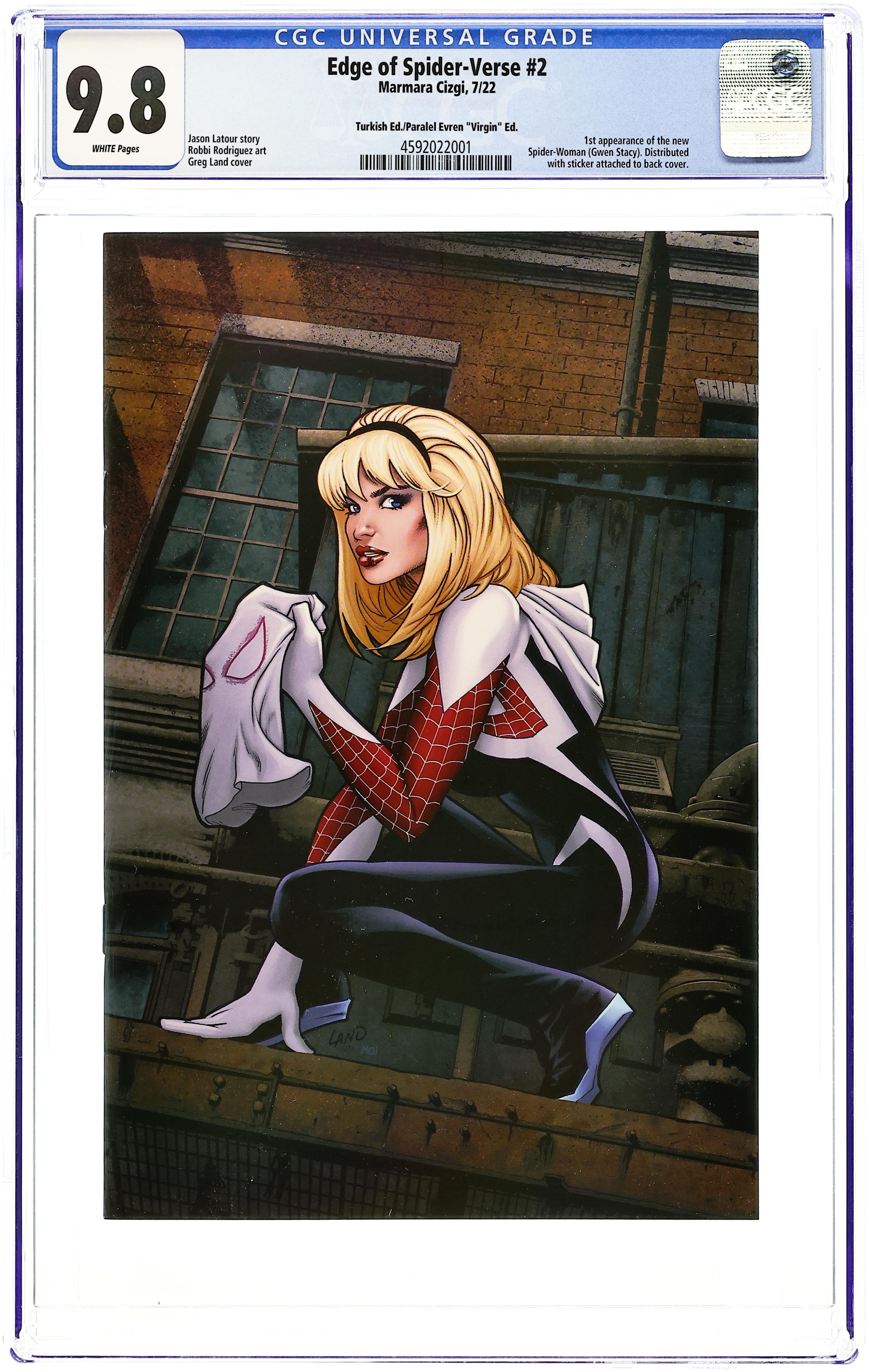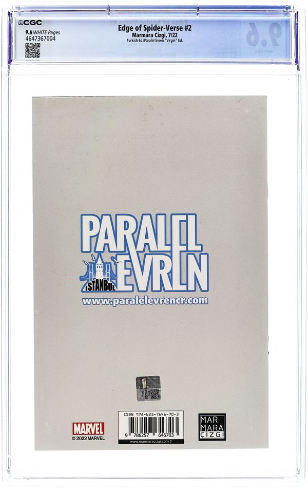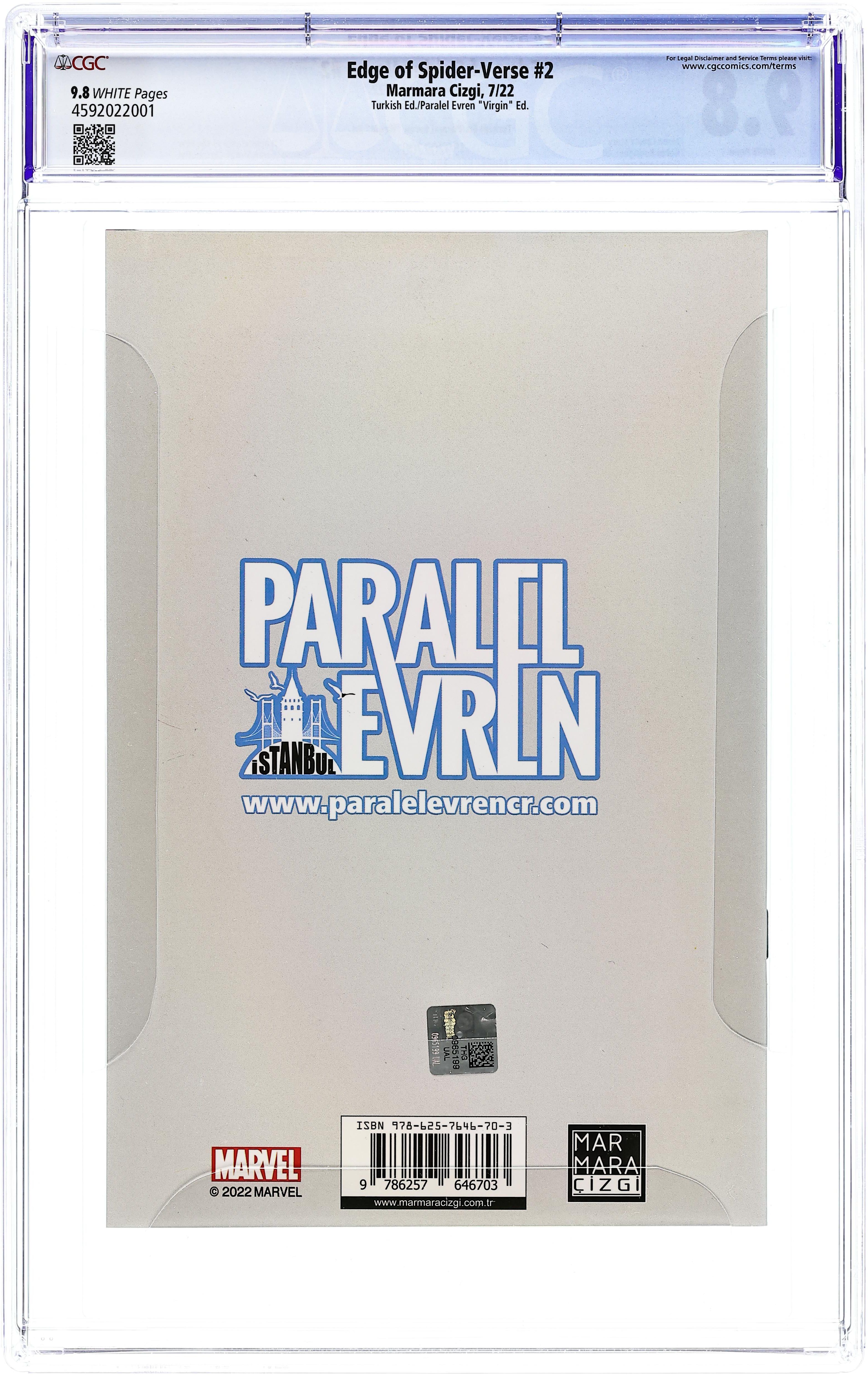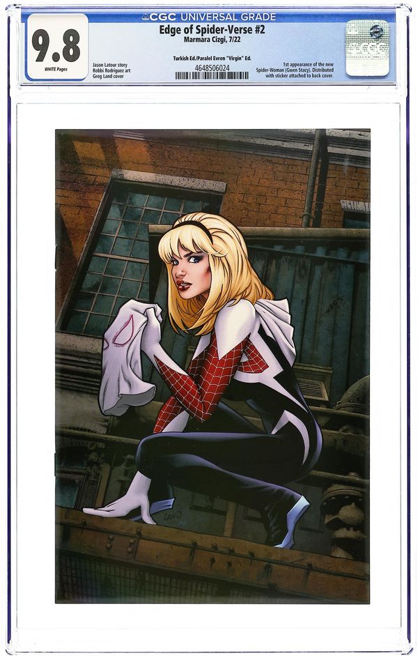 Turkish Edition Reprint Series. Paralel Evren Exclusive Virgin Cover by Greg Land. Reprints Edge of Spider-Verse (2014 Marvel) #2. Story by Jason Latour. Art by Robbi Rodriguez. 6 1/4" X 9 1/4". Turkish Language.