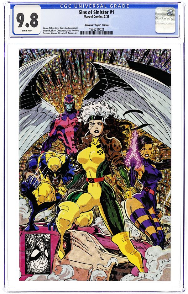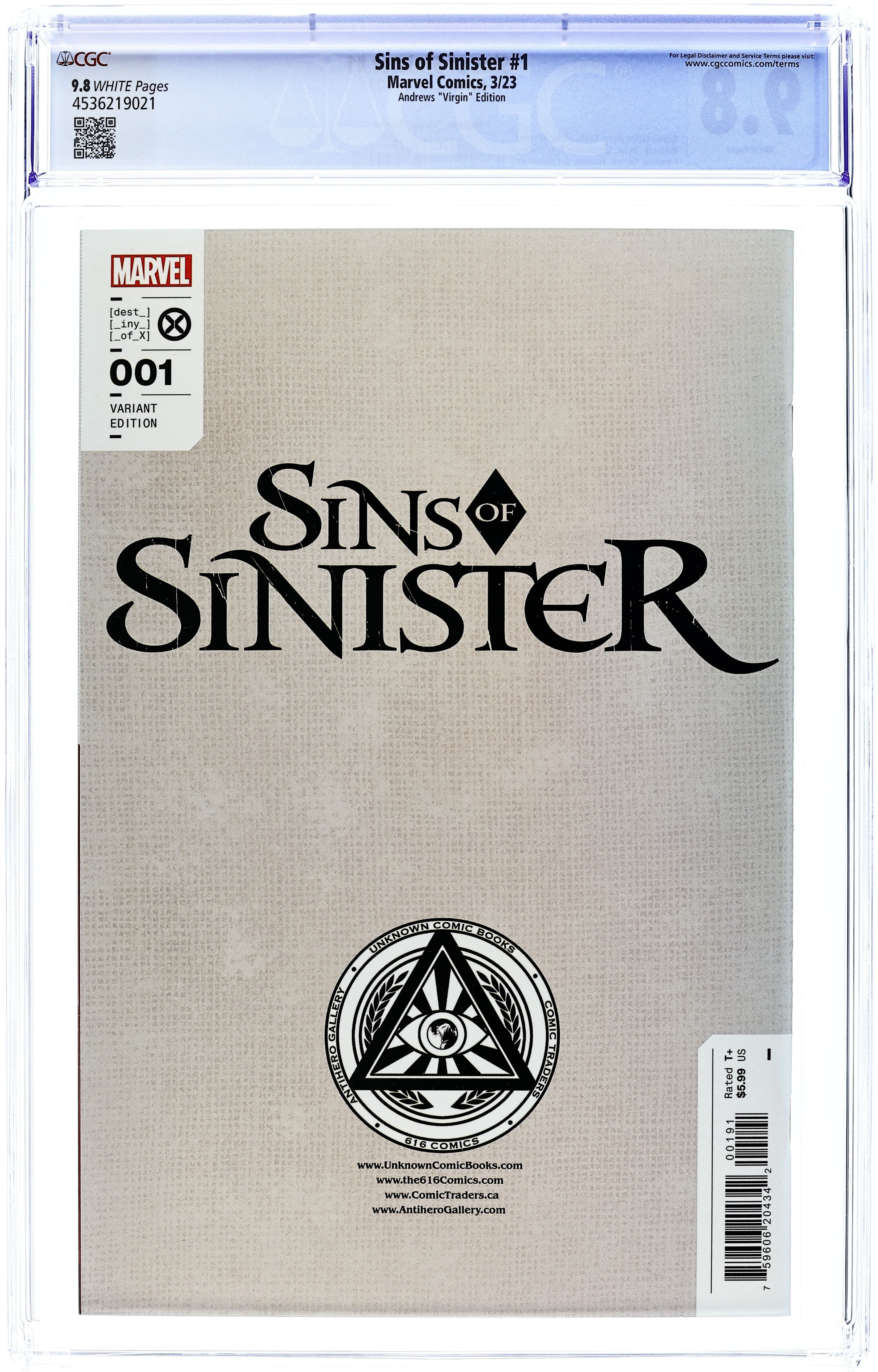 Comics Illuminati (Unknown Comics, Comic Traders, Anti-Hero Gallery, and The 616 Comics) Exclusive Virgin Cover by Kaare Andrews. Written by Kieron Gillen. Art by Lucas Werneck; Marvel Various. POWERS OF ESSEX! It's the end of the world as we know it, and at least Sinister feels fine. For now. Can that last? Especially when we discover that he really is his own worst enemy... The universe-melting X-event begins here, in a horror timeline that makes Age of Apocalypse look like the X-Men Swimsuit Special. Join Kieron Gillen (IMMORTAL X-MEN, AXE: JUDGMENT DAY) as he kicks off the X-Men crossover Sinister has been planning since the beginning…and is going to have to see through to the bitter end. 56 pages, full color. Rated Teen+