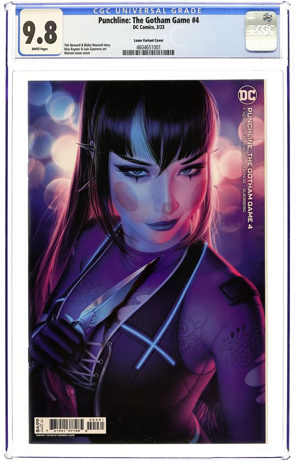 Written by Tini Howard, Blake Howard. Art by Max Raynor. Cover by Warren Louw. BOYS' CLUB! Punchline and the Royal Flush Gang's crusade to reshape the Gotham City underworld continues with a vengeance. But Punchline is done dealing with henchmen and hired assassins...she's going right to the top, forcing a meeting with Black Mask and his criminal hive. Will Punchline have their ear, or will they rip out her heart?! And how will Bluebird recover from the vicious defeat Punchline dealt her as she tries to help her brother? 32 pages, full color. Rated T+ Cover price $4.99.