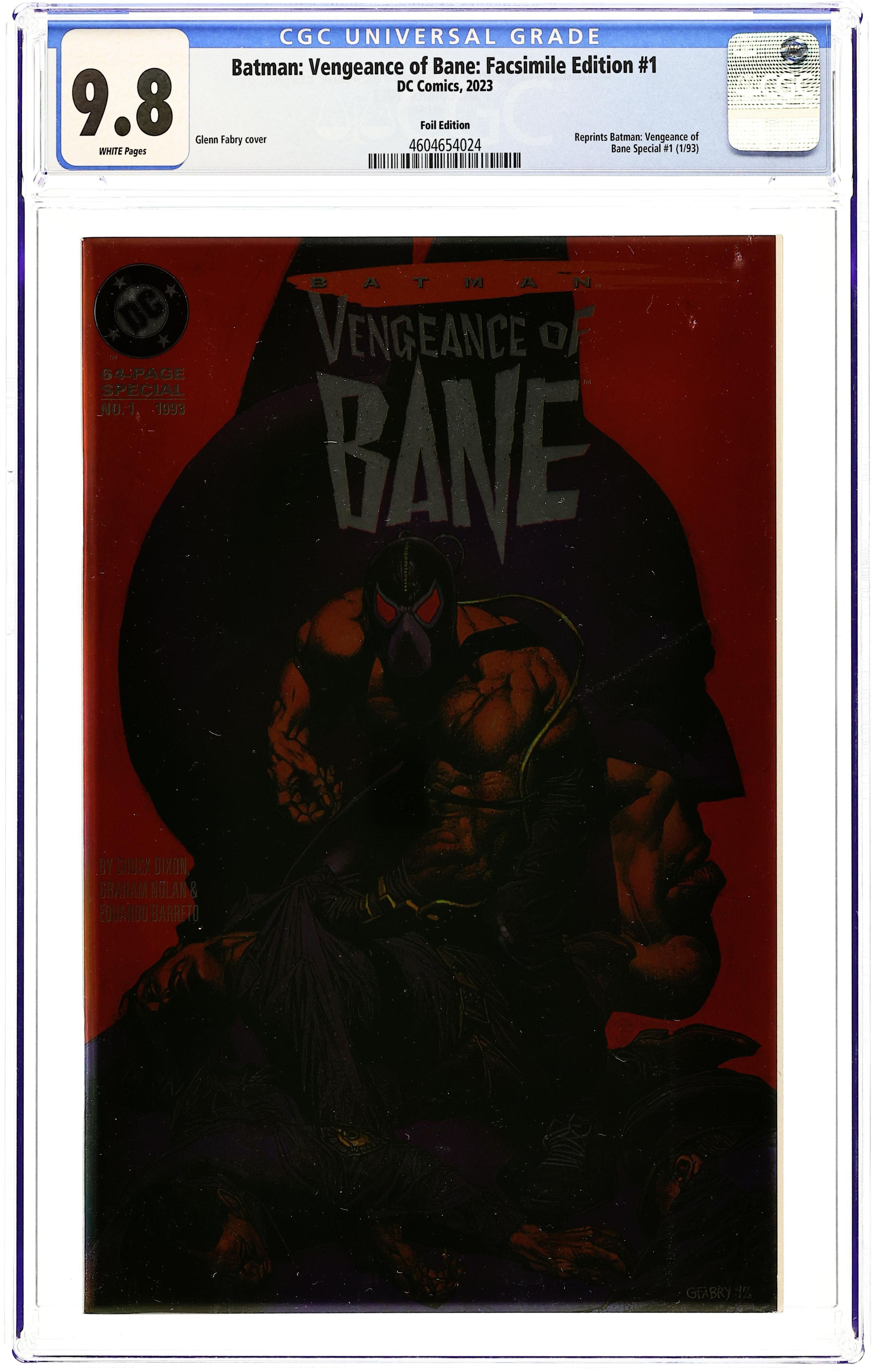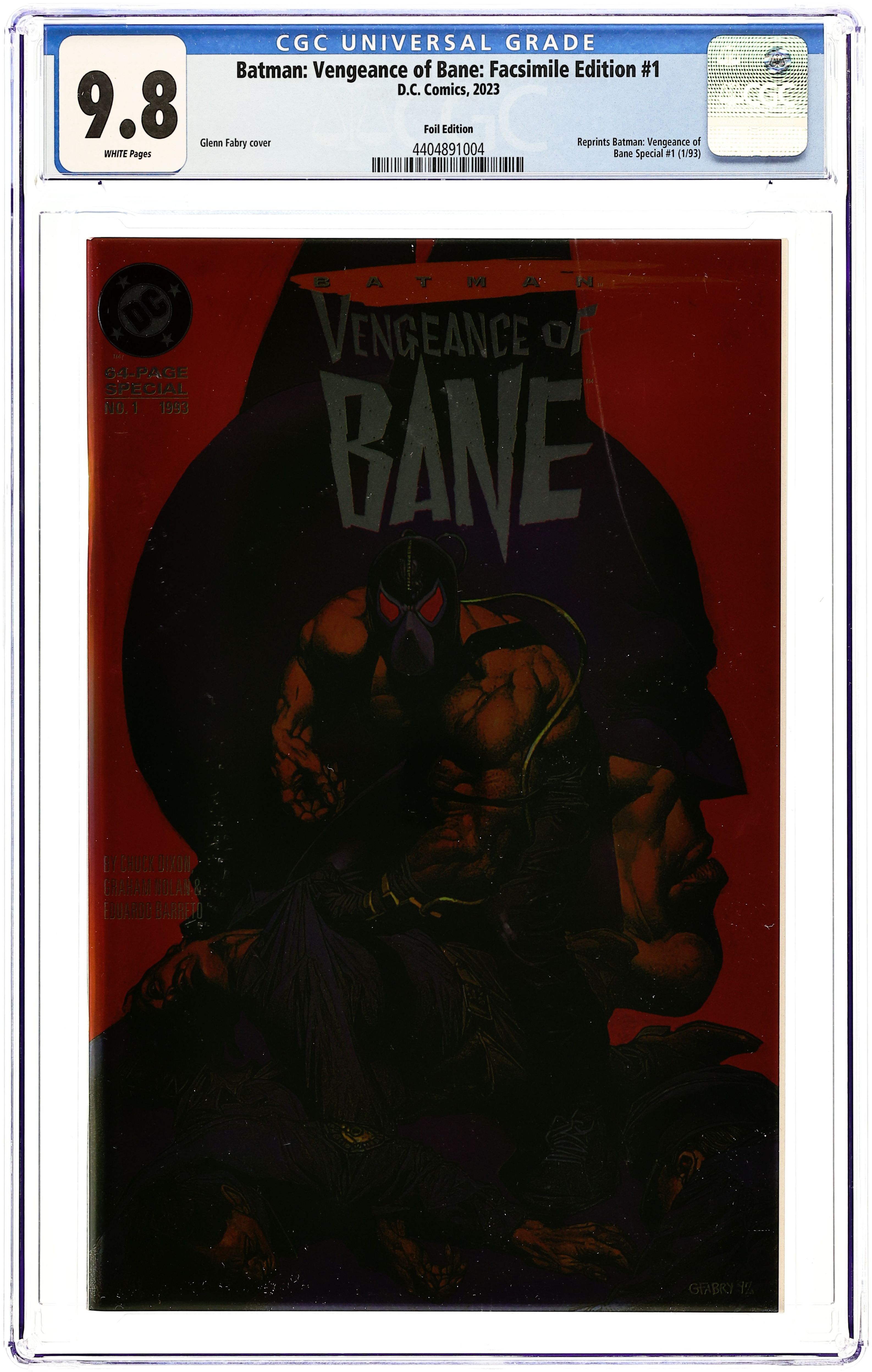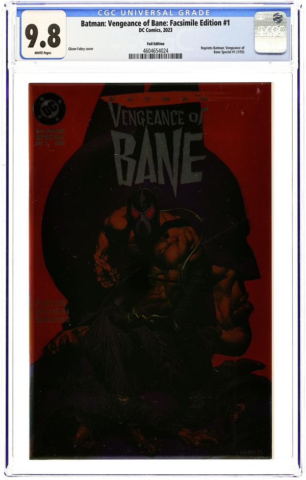 Written by Chuck Dixon. Art by Graham Nolan, Eduardo Barreto. Cover by Glenn Fabry. Comics readers around the world gasped in shock when Bane broke Batman’s back in Batman #497. Now learn the tragic story behind the villain in this facsimile reproduction of Bane's first appearance. Sentenced from birth to serve life imprisonment due to the crimes of his father, Bane honed his body and mind to survive the penal colony of Pena Duro. Fueled by a lifetime of violence and driven by the desire to conquer, Bane escapes from his prison and decides to take over Gotham by destroying its greatest protector--Batman! 32 pages, full color. Rated T+ Cover price $7.99.