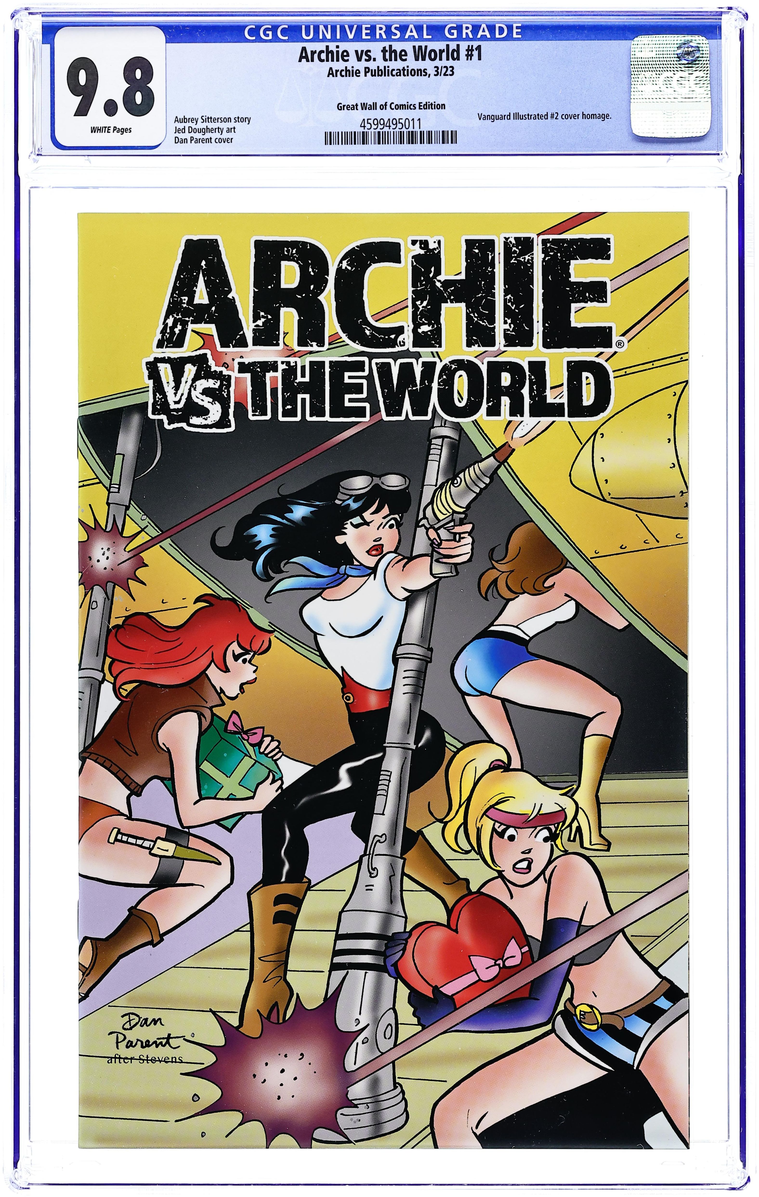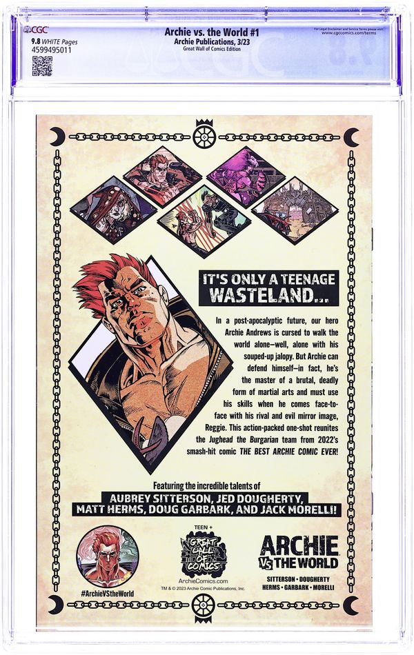 Great Wall of Comics Exclusive Variant Cover by Dan Parent. Written by Aubrey Sitterson. Art by Jed Dougherty. In a post-apocalyptic future, our hero Archie Andrews is cursed to walk the world alone-well, alone with his souped-up jalopy. But Archie can defend himself-in fact, he's the master of a brutal, deadly form of martial arts and must use his skills when he comes face-to-face with his rival and evil mirror image, Reggie. This action-packed one-shot is equal parts Mad Max: Fury Road and The Fist of the North Star, and reunites the Jughead the Burgarian team from 2022's smash-hit comic THE BEST ARCHIE COMIC EVER! 32 pages, full color. Rated Teen+