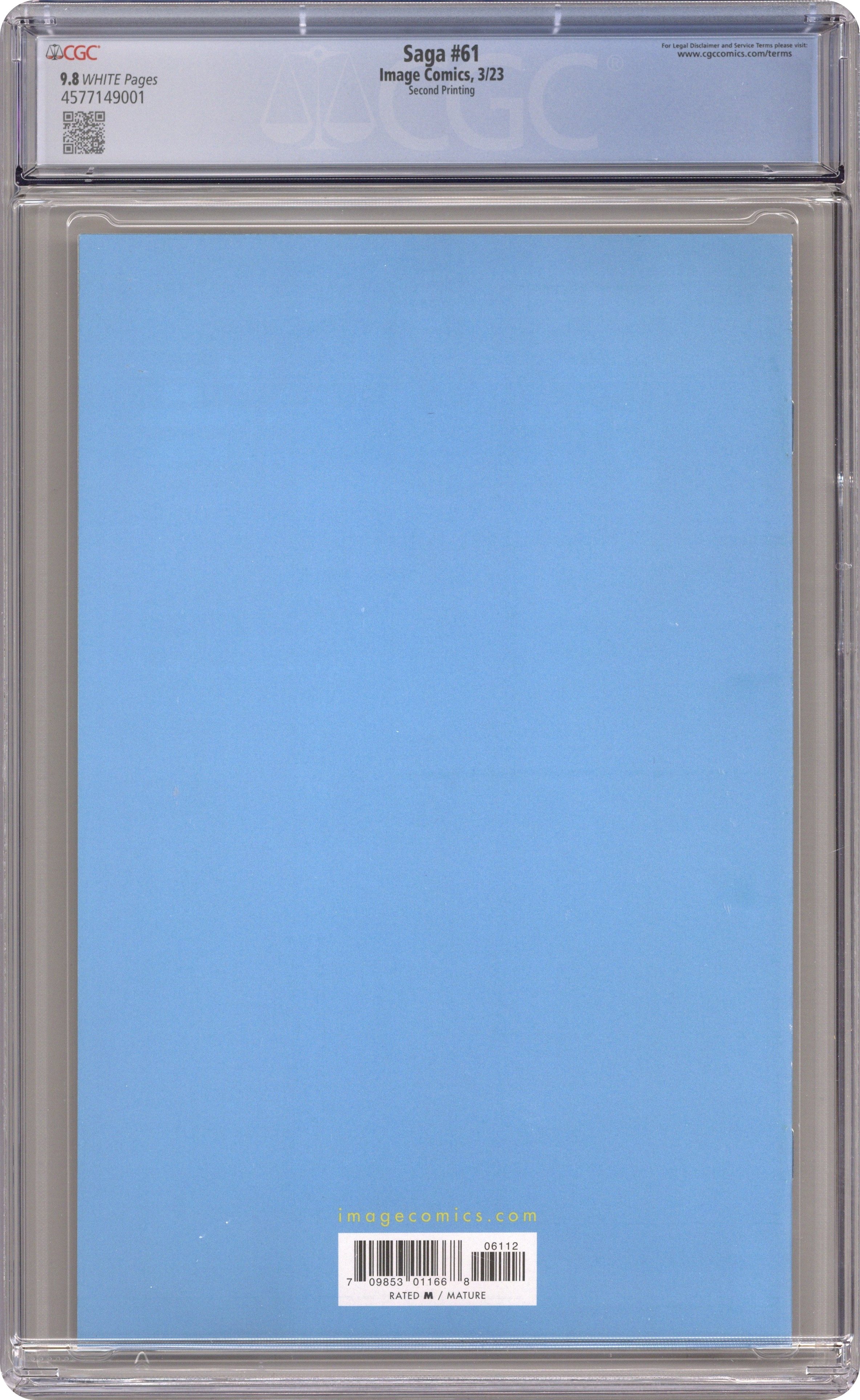 2nd Printing. Written by Brian K. Vaughan. Art and Cover by Fiona Staples. NEW STORY ARC SAGA is back, and it's time for another epic season of emotional adventures and shocking surprises for Hazel and her star-crossed family! About the SAGA series: SAGA has sold seven million copies to date across single issue, trade paperback, compendium, hardcover, and digital editions and has been translated into 20 languages. The series also boasts multiple Eisner Awards, Harvey Awards, a Hugo Award, British Fantasy Award, Goodreads Choice Award, Shuster Award, Inkwell Award, Ringo Award, and more. It has been featured in such mainstream media outlets as TIME, Entertainment Weekly, The Atlantic, NPR, and more. The series has become a pop culture phenomenon and has been immortalized with references and easter eggs appearing in such popular TV shows as Supernatural, The Big Bang Theory, The Simpsons, and even a recent Taco Bell commercial featuring the characters dressed in cosplay. 28 pages, full color. Rated M Cover price $3.99.