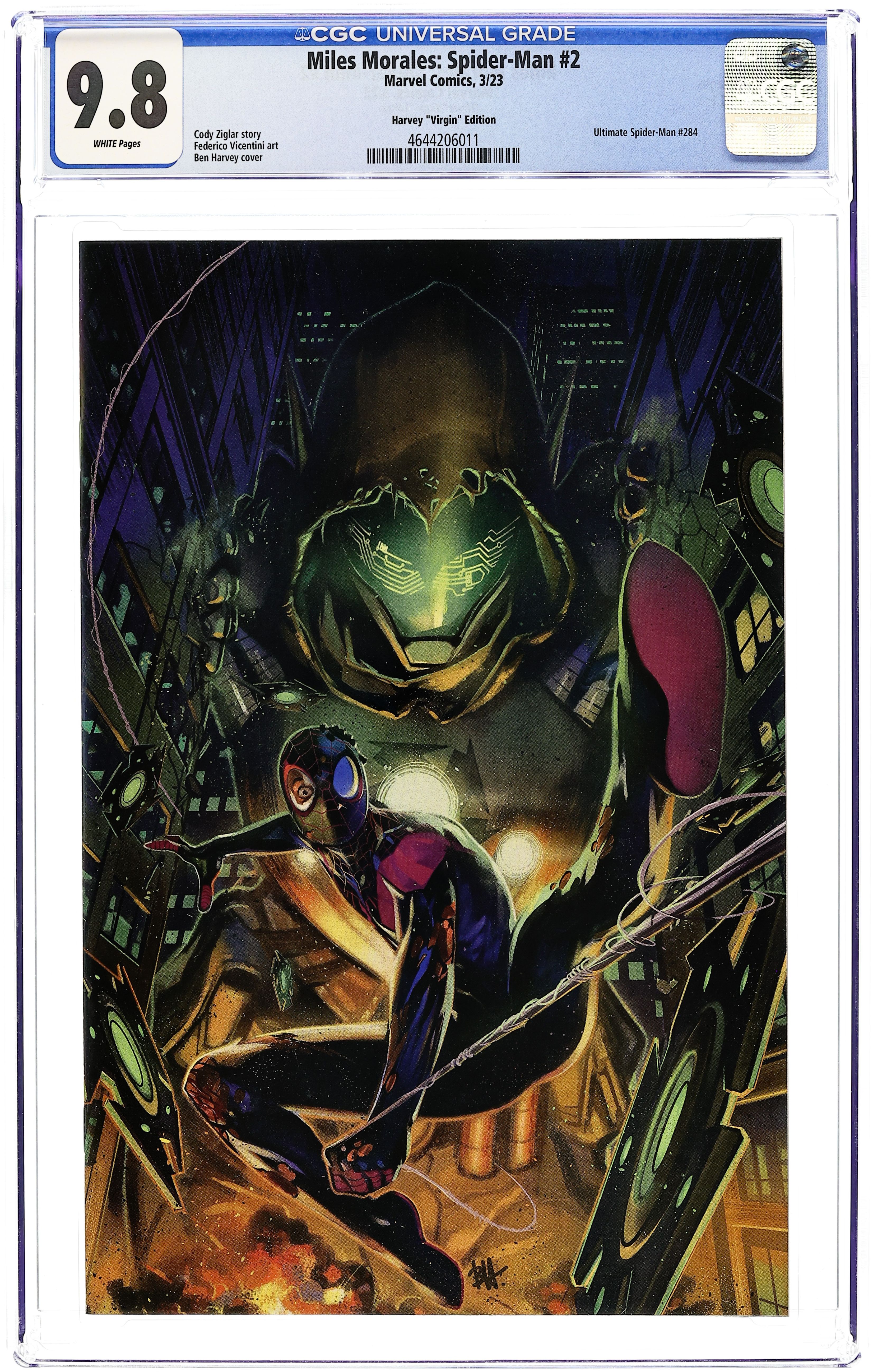 Comics Illuminati (Unknown Comics, Comic Traders, Anti-Hero Gallery, and The 616 Comics) Exclusive Virgin Cover by Ben Harvey. Written by Cody Ziglar. Art by Federico Vicentini. SPIDEY VS. THE SCORPION'S STING!MILES MORALES' world is spinning out of control! A mysterious new threat is rising and coming at SPIDER-MAN hard, and if Spidey doesn't fight back with everything he's got-he could LOSE everything. What does this new villain have to do with MISTY KNIGHT's investigation and a slew of upgraded foes, like THE SCORPION, terrorizing NYC? This battle is going to change Spidey's life forever-someone's not walking away from this one! 28 pages, full color. Rated T