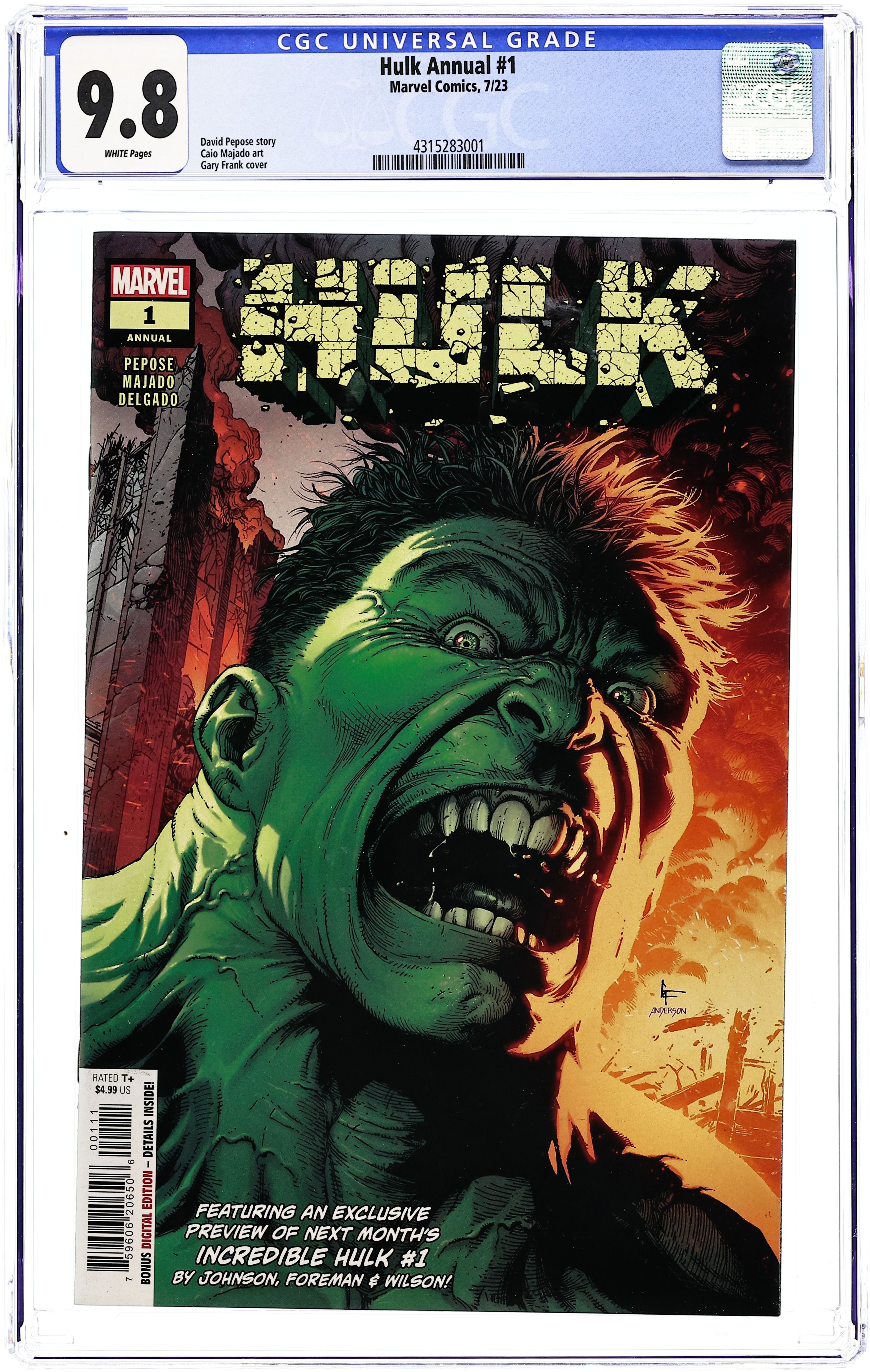 Written by David Pepose. Art by Caio Majado. Cover by Gary Frank. HULK VS. GIGANTO! A documentary crew is on the hunt for a monster at the heart of a gamma radiation leak, but they get much more than they bargained for when they end up on Hulk's angry side - and caught in the middle of a brawl between two unstoppable giants, as Hulk battles an unleashed Giganto! Plus: A special preview, exclusive to this issue, of the shocking new direction Hulk is headed in this summer! 36 pages, full color. Rated T+ Cover price $4.99.