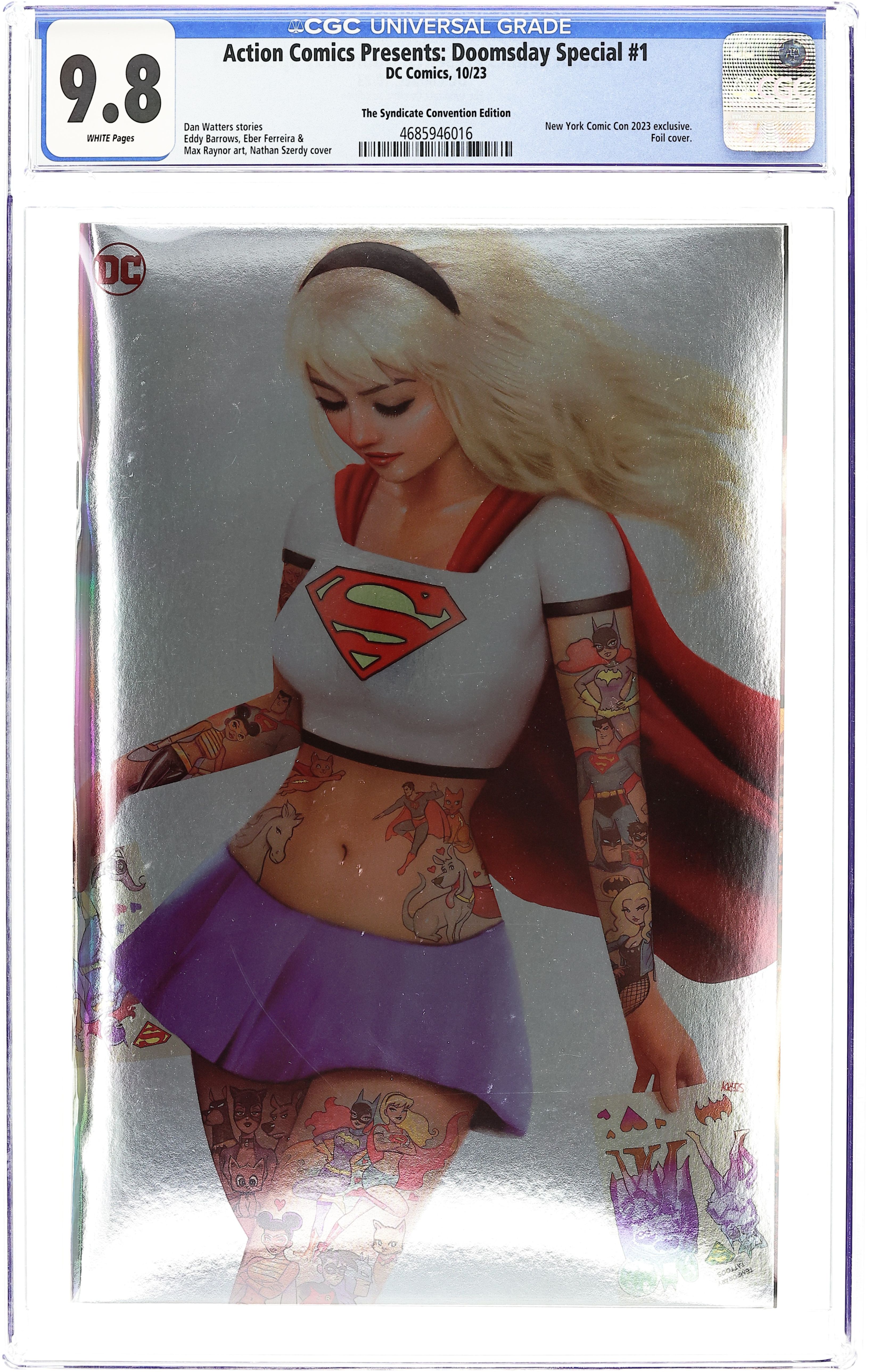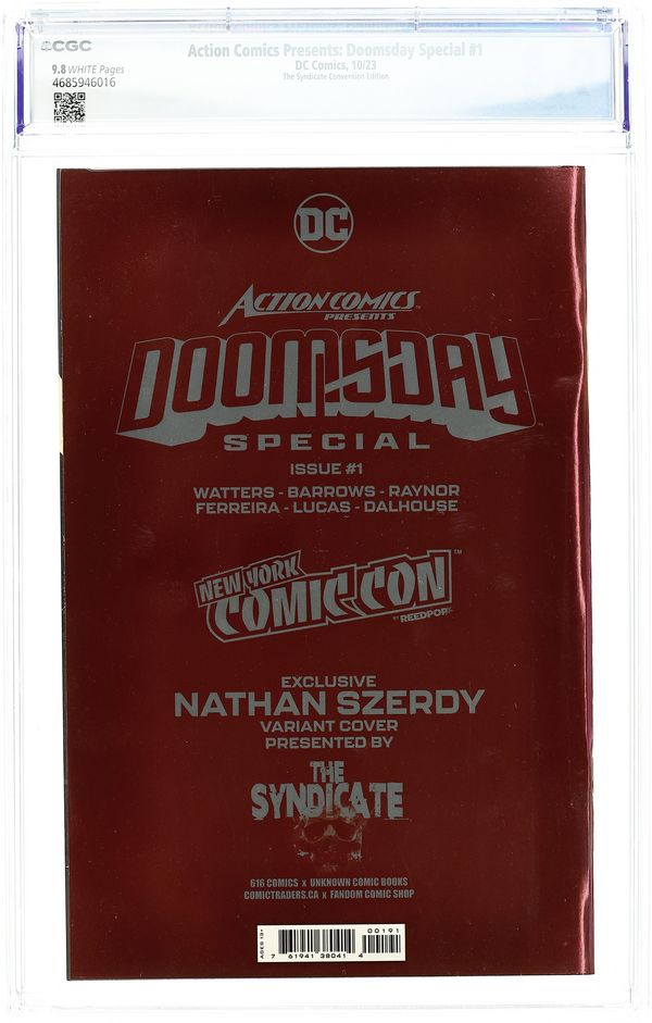 The Syndicate New York Comic Con Exclusive Foil Edition Virgin cover by Nathan Szerdy. Written by Dan Watters. Art by Eddy Barrows. DOOMSDAY RULES...IN HELL! It is a creature beyond reason--and the only force in the universe strong enough to kill Superman. It's Doomsday, the living embodiment of death, destruction, and evolution! In the wake of Dark Crisis and Lazarus Planet, King Doomsday now sits on a throne of skulls across a river of blood, holding court over the demons that swarm in the depths of Hell...and he may have just found a way back to the land of the living. It's now up to Supergirl and Martian Manhunter to drive the beast back and see that he never again returns to our earthly plane--even if they must die to do it! Plus: the return of Bloodwynd, the debut of the Doomhounds, and a clue to the next big Superman event! 48 pages, full color. Rated T+ Cover price $6.99.