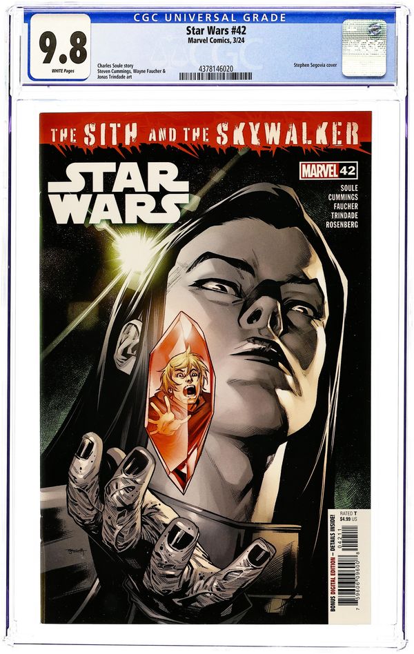 Written by Charles Soule. Art by Steven Cummings. Cover by Stephen Segovia. SITH RISING! LUKE SKYWALKER knows his destiny is leading him toward a confrontation with DARTH VADER. But Vader is a Dark Lord of THE SITH, and Luke is barely even a JEDI. To have any chance at survival, he must find a way to train himself in the battle techniques he will soon face. He must find...ANOTHER SITH! 32 pages, full color. Rated T Cover price $4.99.