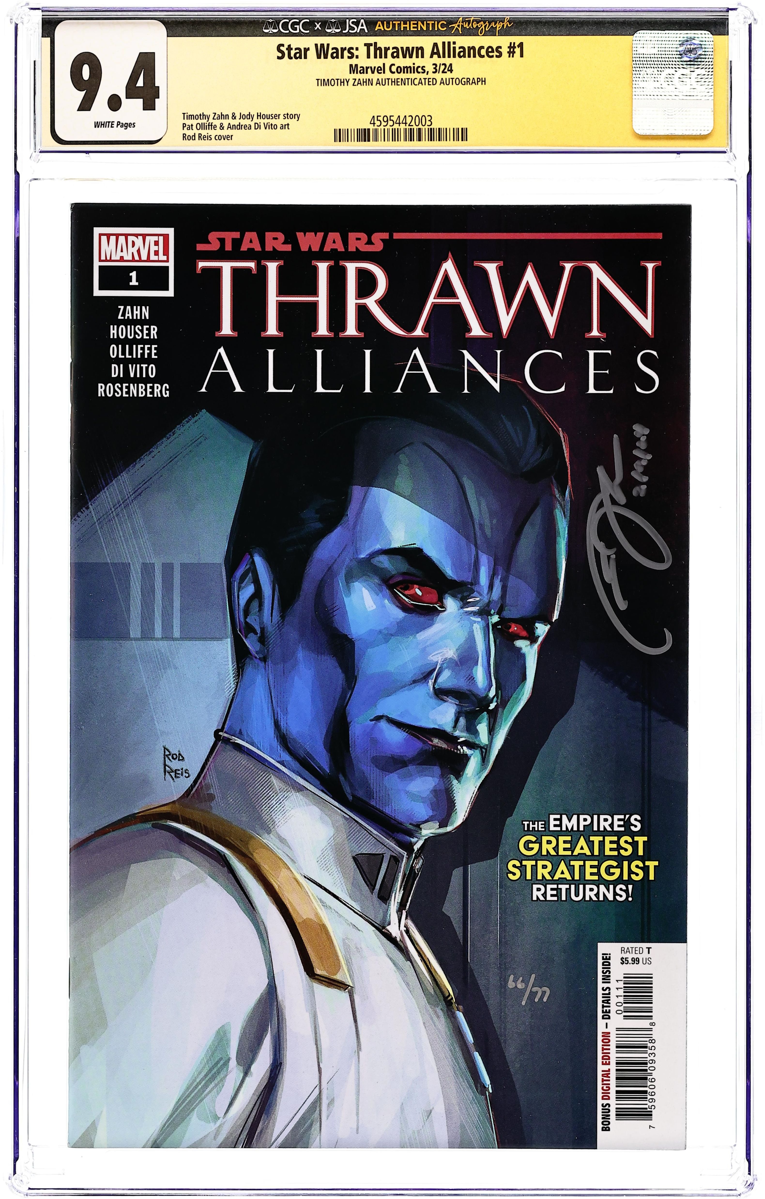 Written by Jody Houser; Timothy Zahn. Art by Andrea Di Vito; Pat Olliff. Cover by Rod Reis. RETURN TO THE SAGA OF THRAWN WITH THE COMIC-BOOK ADAPTATION OF THRAWN: ALLIANCES! TIMOTHY ZAHN teams with STAR WARS veteran JODY HOUSER to bring THRAWN: ALLIANCES to the pages of comic books! Watch as ANDREA DI VITO & PAT OLLIFFE bring the action to life showcasing the tactical prowess of the galaxy's most dangerous mind! 40 pages, full color. Rated T Cover price $5.99.