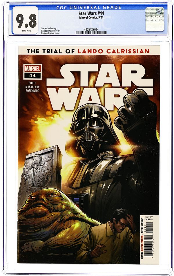 Written by Charles Soule. Art by Madibek Musabekov. Cover by Stephen Segovia. THE TRIAL OF LANDO CALRISSIAN! After the events of DARK DROIDS, LANDO is at a crossroads. Saving his friend LOBOT has cost him more than he expected as now ADMIRAL ACKBAR and MON MOTHMA are putting Lando on trial. With THE REBELLION locked in battle with THE EMPIRE, how will this trial's end impact the Rebellion's future? 32 pages, full color. Rated T Cover price $4.99.