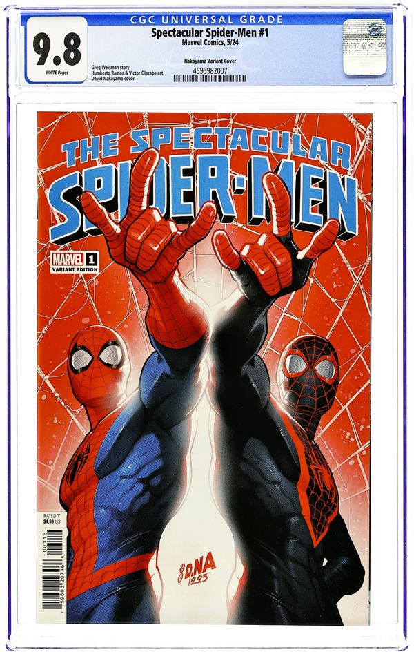 Limited 1 for 25 Retailer Incentive Variant Cover. Written by Greg Weisman. Art by Humberto Ramos. Cover by David Nakayama. The stars of two of Marvel's biggest series come together in their first ongoing series ever! That's right, Peter Parker and Miles Morales are going to team up on the regular, comparing notes and using said notes to take on some of their most dangerous bad guys. This duo is better than dynamic, amazing, sensational, superior…they're SPECTACULAR! And with GREG WEISMAN, writer of the fan-favorite animated Spectacular Spider-Man series, returning to Spidey along with Spider-Legend HUMBERTO RAMOS, you know it's going to be epic. 40 pages, full color. Rated T Cover price $4.99.