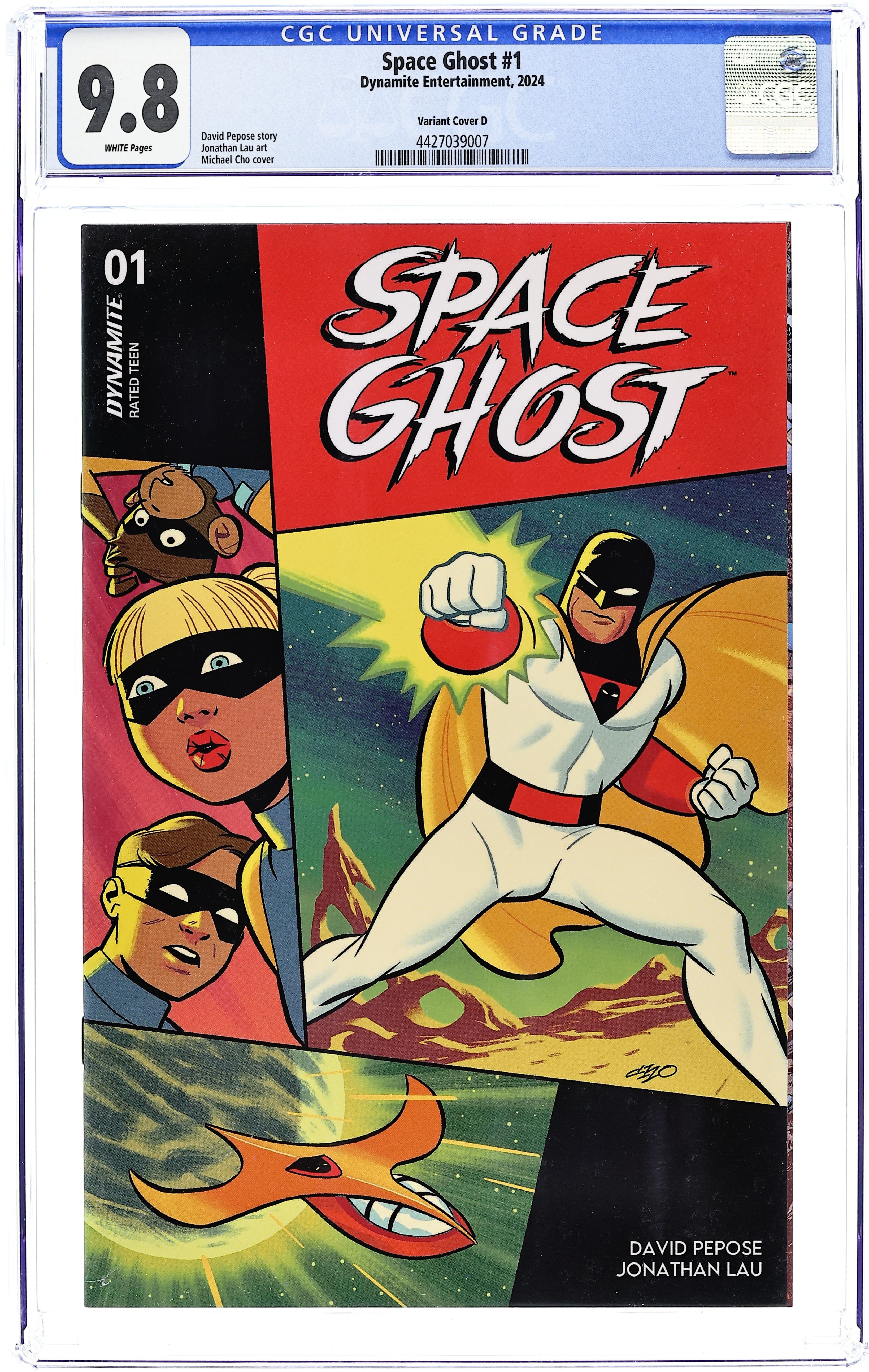 Written by David Pepose. Art by Jonathan Lau. Cover by Michael Cho. Greed and corruption flourish in the darkness between stars. With the territories of the Galactic Federation spread far and wide across the vastness of space, pirates and hijackers ransack the distant colonies with cruel disregard for the innocent scientists living within them. Yet there is a cosmic vigilante who metes out justice throughout the galaxy, bringing vengeance to those prey upon the defenseless. Some say he is a policeman who has abandoned the strictures of the law. Others say he is a phantom, the sole survivor of a war-torn planet. And those who have survived his wrath claim he is more a force of nature, able to bend the very elements of Creation to decimate his enemies. They call him the SPACE GHOST - and his adventures begin here! Award-winning writer DAVID PEPOSE (Punisher) and superstar artist JONATHAN LAU (Vampirella Strikes) kick off this action-packed series with a surprise attack on Space Colony Omicron - home of the brilliant scientist Dr. Jerrod Keplar and his young children, Jan and Jace, as well as their pet monkey, Blip. With the colony's defenses overwhelmed, all seems lost - but these ruthless pirates didn't count on the wild card that is Space Ghost! 32 pages, full color. Rated T Cover price $4.99.