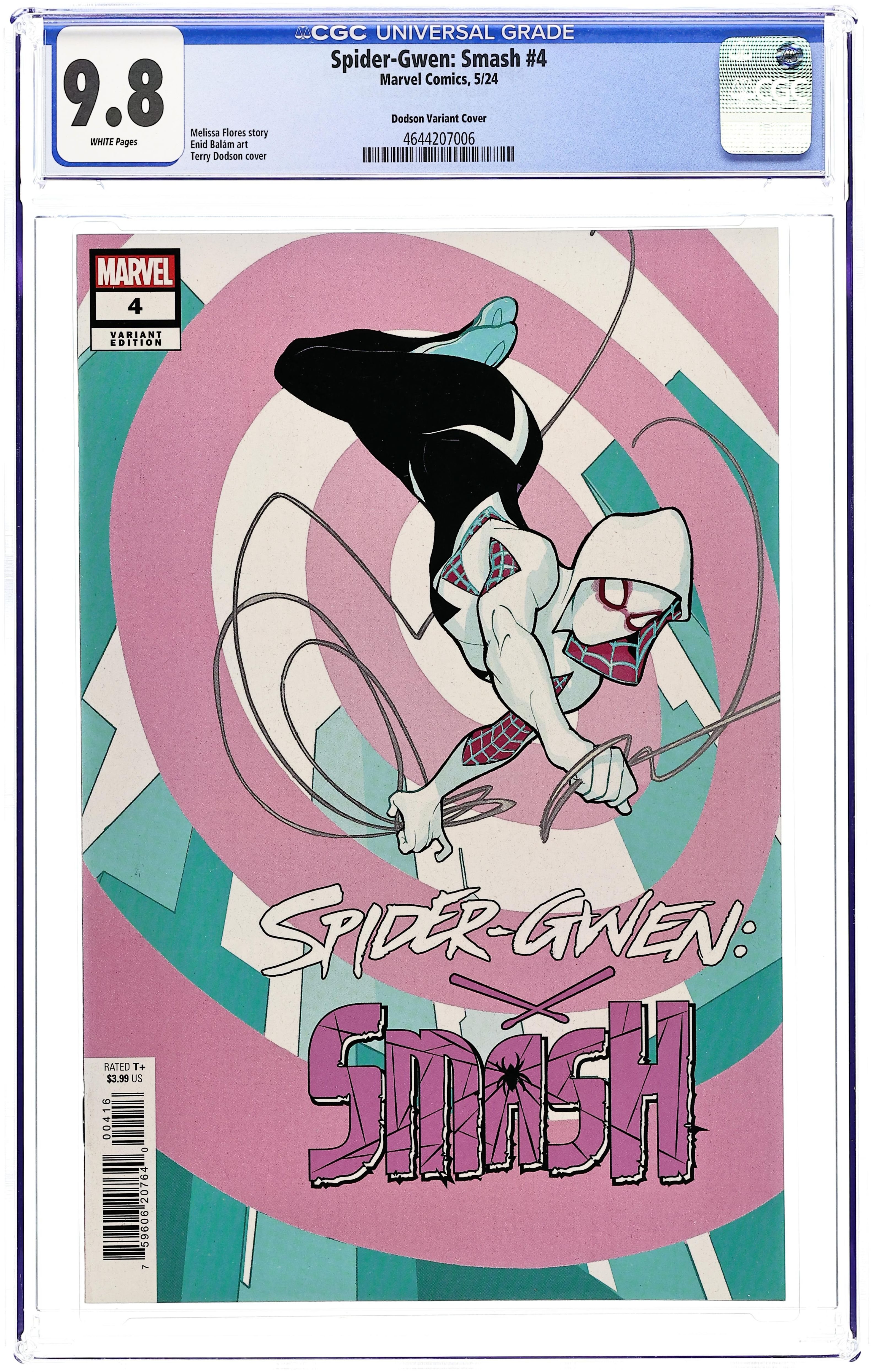 Limited 1 for 25 Retailer Incentive Variant Cover. Written by Melissa Flores. Art by Enid Balam. Cover by Terry Dodson. This tour was just supposed to be about the music, but when Bruce Banner's experiments yield shockingly symbiotic results, Gwen will have to finally pick a side in this all-out super-hero smash fest! 28 pages, full color. Rated T+ Cover price $3.99.