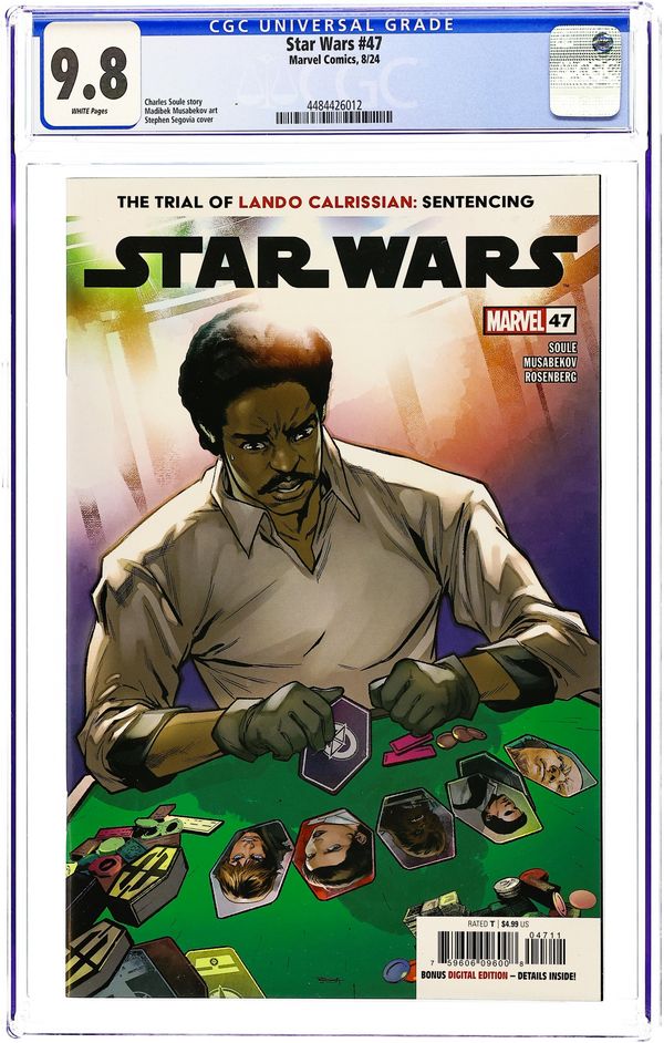 Written by Charles Soule. Art by Madibek Musabekov. Cover by Stephen Segovia. LANDO IS ALL IN! • THE TRIAL OF LANDO CALRISSIAN for treason against the REBEL ALLIANCE comes down to its stunning finale! • The evidence is not in Lando's favor, nor is the fact that he's offered a full confession to the crimes of which he is accused. • Does he have any cards left to play? 32 pages, full color. Rated T Cover price $4.99.