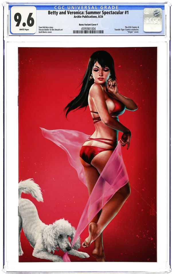 The 616 Comics and Tuxedo Tiger Comics Exclusive "Veronica Red" Edition Virgin Cover by Josh Burns. Written by Tom DeFalco. Art by Jim Amash, Steven Butler and VARIOUS. BRAND NEW STORY: Chaos reigns when Betty and Veronica's plans for a tranquil girls' night with a few friends are ruined by Archie and a team of boisterous Little Leaguers! Plus, even more fun-in-the-sun stories! 32 pages, full color.
