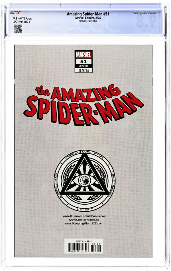 Comics Illuminati (Unknown Comic Books, Comic Traders, and Sleeping Giant) Exclusive Foil Edition Virgin Cover by David Nakayama. Written by Steve Orlando. Art by Jacopo Camagni. STEVE ORLANDO'S SCARLET WITCH RUN REIGNITES! The Scarlet Witch has carved out a haven for herself in upstate New York, but it's all about to go up in flames. Wanda's newfound peace has drawn the wrath of a primal force unlike anything she's ever faced before, and it won't stop until it razes Wanda's world to the ground. It's a clash of titans as Wanda and her allies fight for all she holds dear! What happens when an unstoppable force meets the end of all things? When pure chaos meets pure destruction? Wanda's about to find out - if she survives long enough. Jacopo Camagni (X-MEN: RED, Nomen Omen) joins writer Steve Orlando for an explosive new chapter of Scarlet Witch's story! 40 pages, full color. Rated T+ Cover price $4.99.