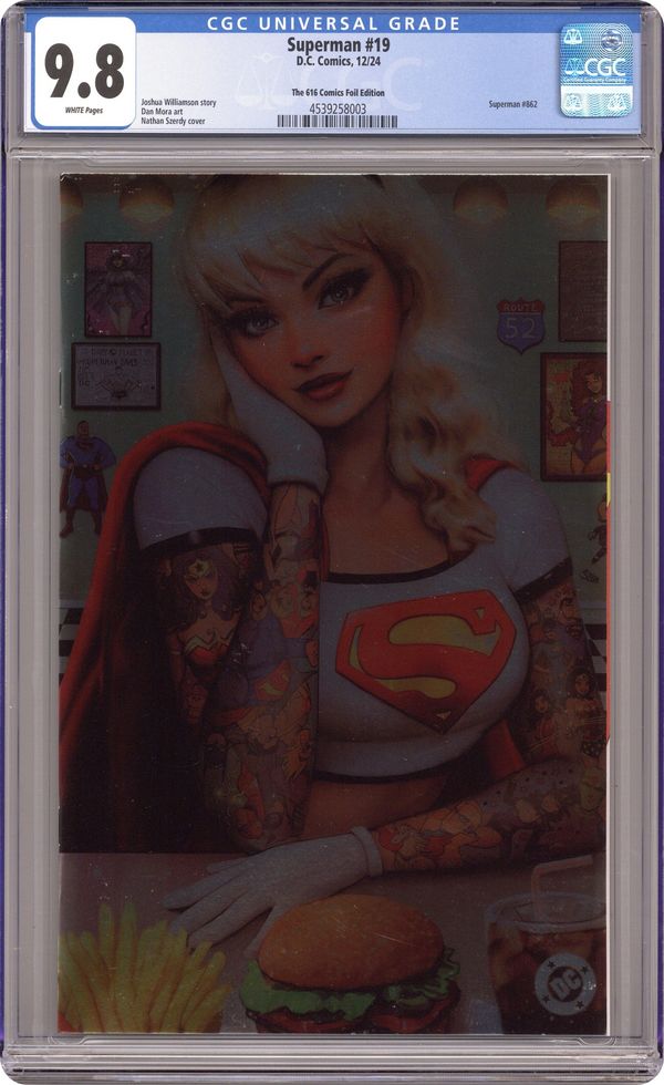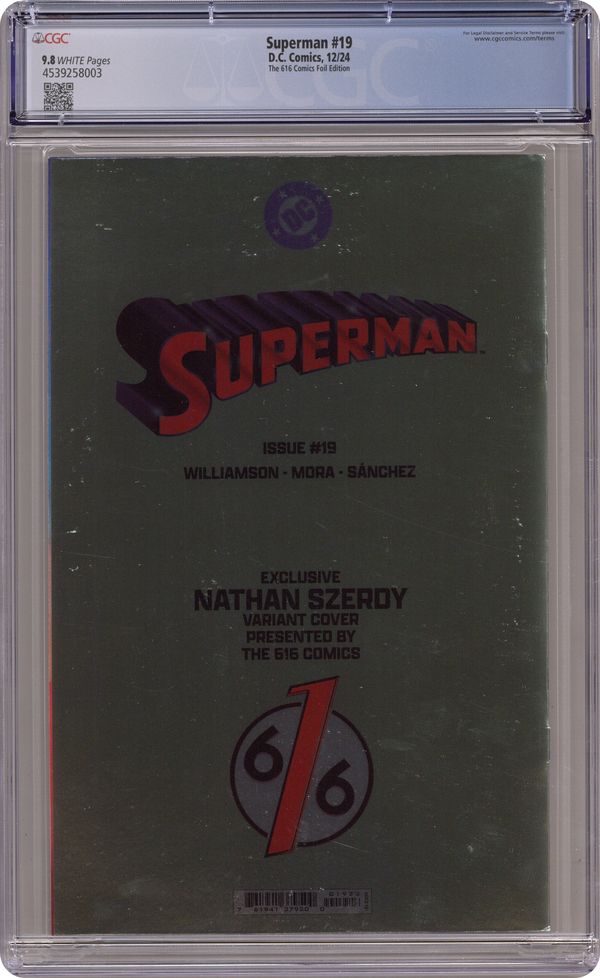 The 616 Comics Exclusive Foil Edition Virgin Cover by Nathan Szerdy. Written by Joshua Williamson. Art by Dan Mora. THE MANY DEATHS OF DOOMSDAY! Superman and Superwoman must deal with the return of the rampaging Doomsday and...wait...Superwoman?! After the events of Absolute Power, Lois Lane has new powers...but how long can they last?! And waiting in the shadows is one of Superman's greatest enemies...the Time Trapper. Jump on to a new exciting story arc that will shape the future of Superman! 32 pages, full color. Rated T+
