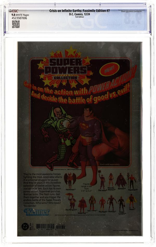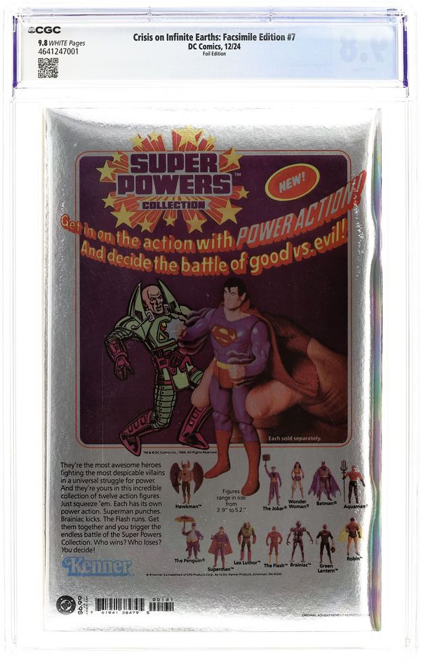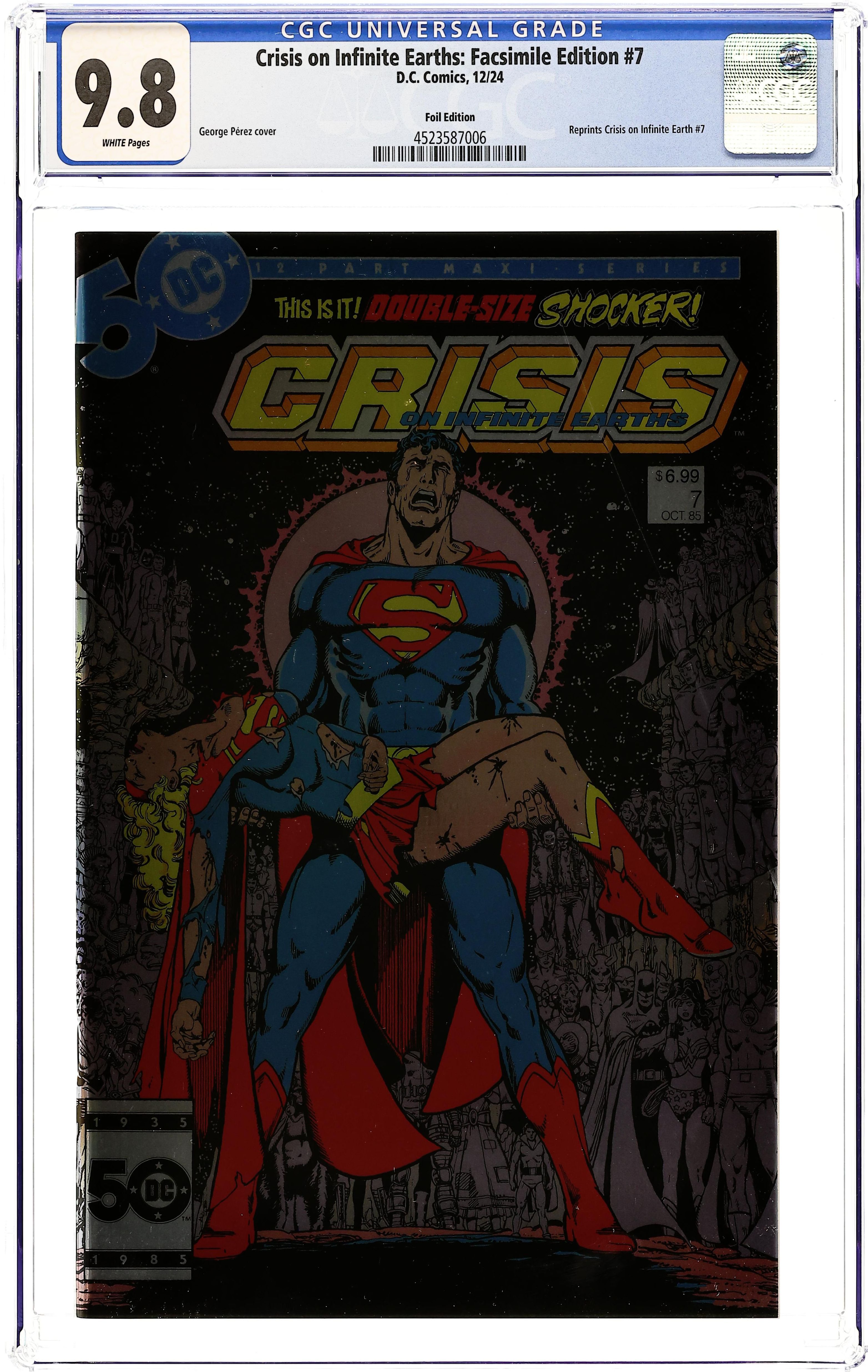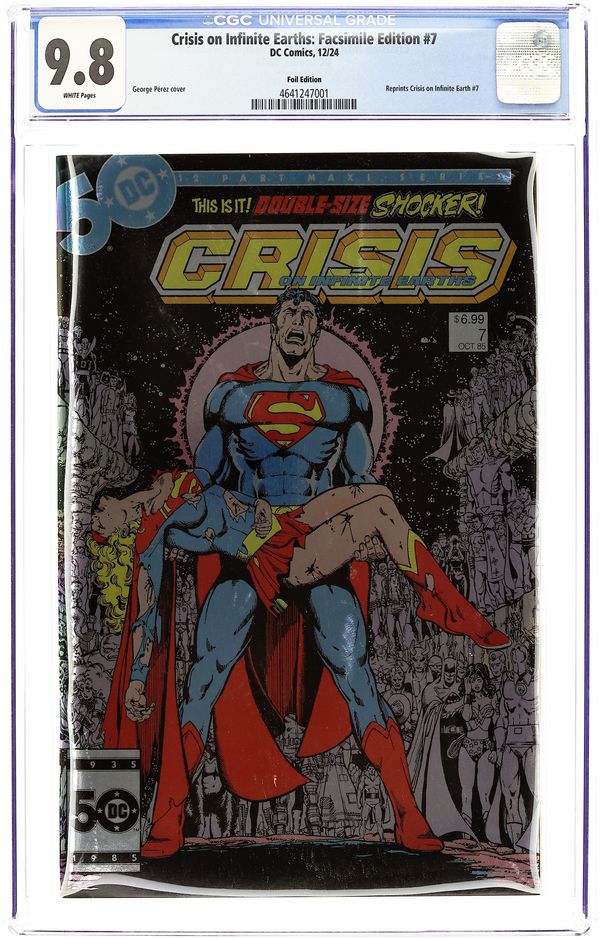 Written by Marv Wolfman. Art by George Perez, Jerry Ordway, Dick Giordano. Cover by George Perez. THE DEATH OF SUPERGIRL! The double-size shocker that broke the hearts of the DC Universe is fully reprinted in this facsimile edition. The bravest and strongest heroes remaining from our Multiverse close in on the stronghold of the antimatter universe but suffer a tragic loss. 48 pages, full color. Rated T+ Cover price $6.99.