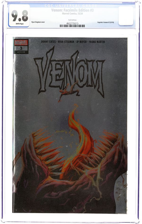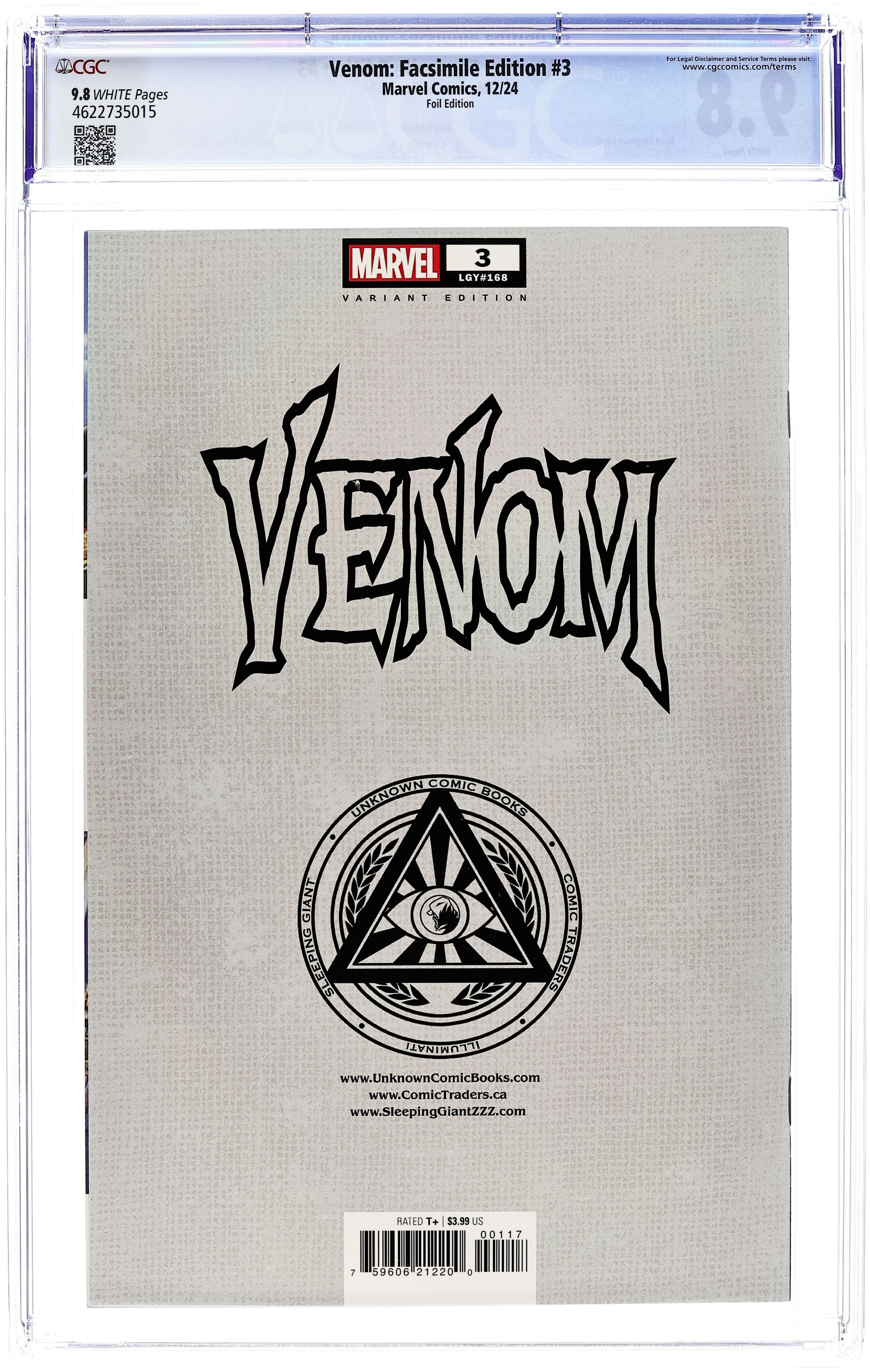Comics Illuminati (Unknown Comics, Comic Traders, and Sleeping Giant) Exclusive Foil Edition Cover by Ryan Stegman. Written by Donny Cates. Art by Ryan Stegman. REPRINTING THIS CLASSIC VENOM STORY!• Still recovering from his injuries, Eddie Brock - the Wicked Web-Slinger known as VENOM - has to defend NYC against the most powerful foe he's ever faced!• The only thing standing in his way? Miles Morales...SPIDER-MAN!• Though Eddie and the symbiote have no qualms with this particular web-slinger, the same can't be said for Miles' feelings about Venom... 28 pages, full color. Rated T+ Cover price $3.99.