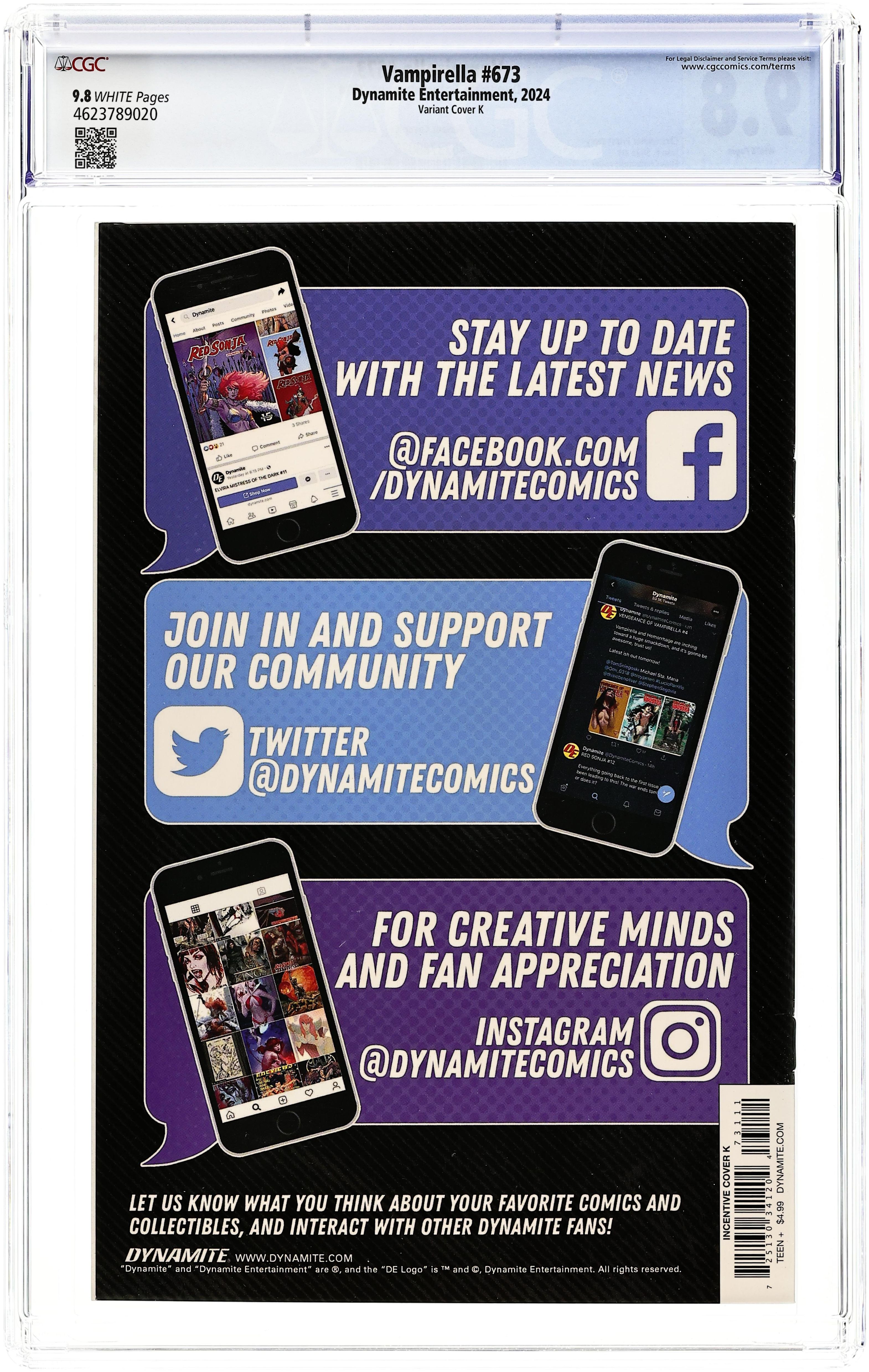 Tags: VampirellaPublished Dec 2024 by Dynamite Entertainment.Vampirella (2024 Dynamite) 673K CGC 9.8 Chatzoudis Virgin 1:20 Variant