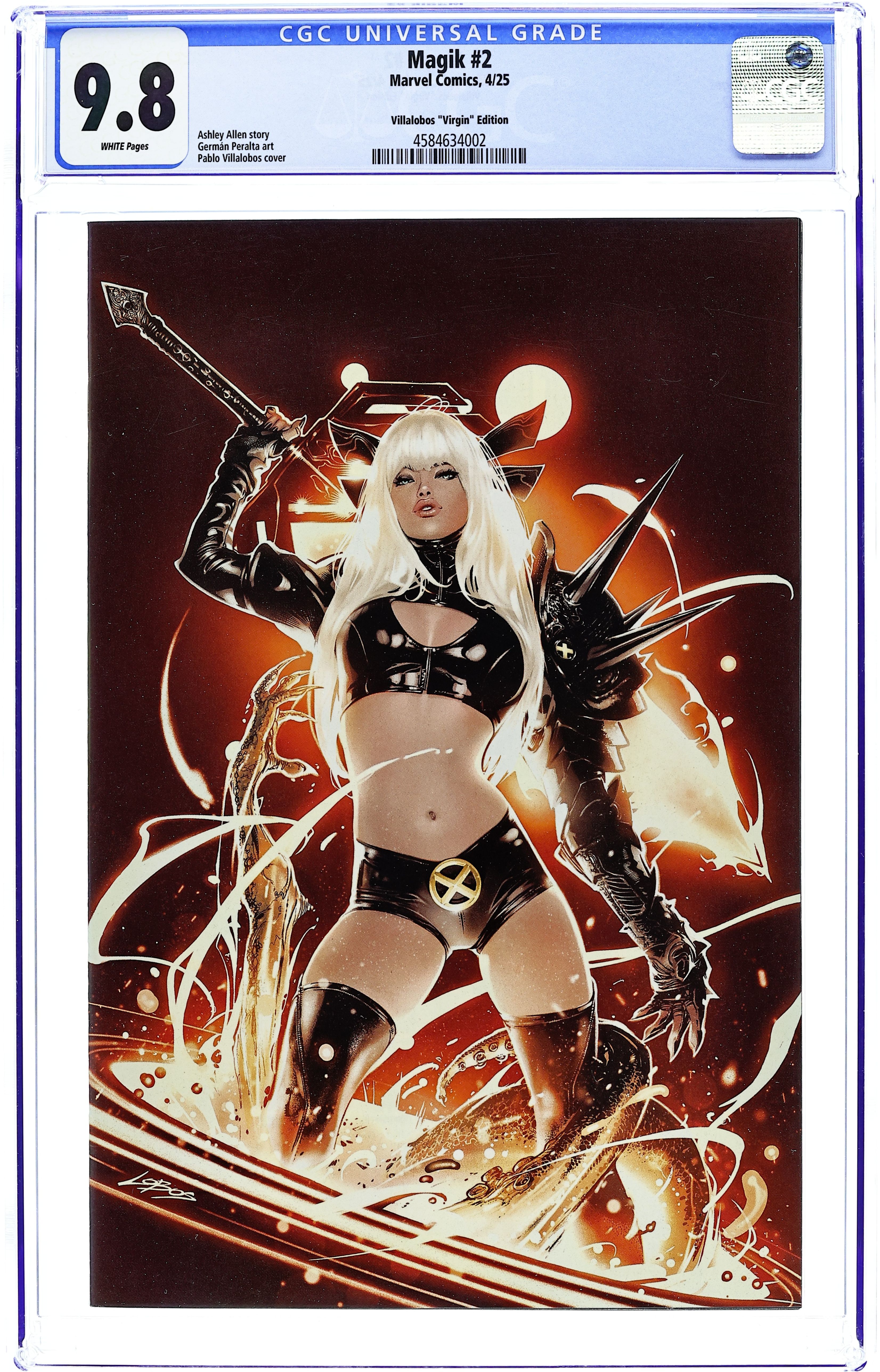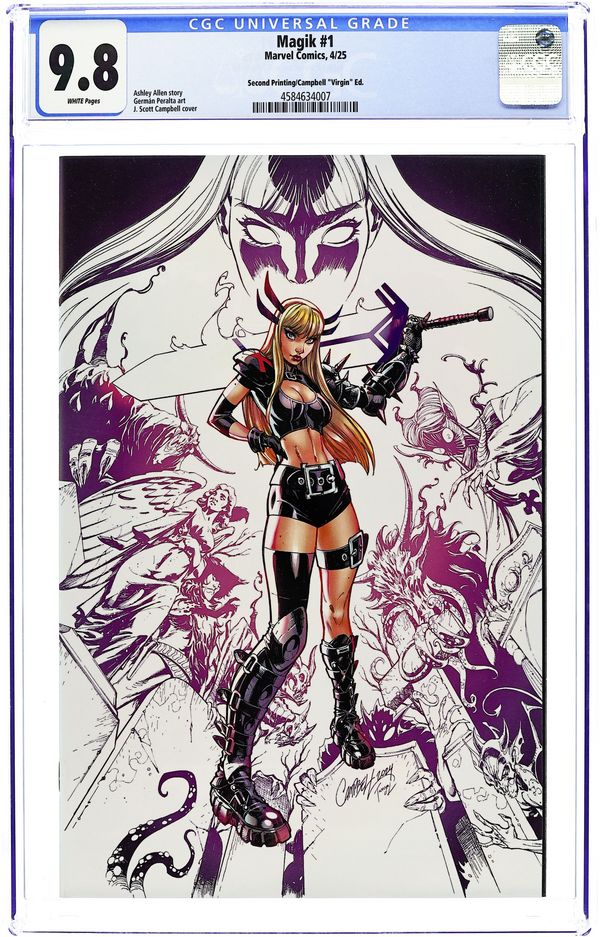 2nd Printing. Limited 1 for 25 Retailer Incentive Variant Cover. Written by Ashley Allen. Art by German Peralta. Cover by J Scott Campbell. THE MYSTIC MUTANT GOES DEMON HUNTING IN HER OWN NEW, ONGOING SERIES! The X-Man Ilyanna Rasputina strikes out on her own with new allies and dark powers arrayed against her. Something ancient has awakened beneath the Alaskan ice. Unfortunately for it, that's Magik's territory now! Written by rising star Ashley Allen (X-MEN: BLOOD HUNT - MAGIK, MARVEL ZOMBIES: BLACK, WHITE & BLOOD) and illustrated by the incomparable Germán Peralta (LOKI, BLACK PANTHER), this is a stylish, high-octane demon-hunting adventure starring the fiercest X-Man of them all! 32 pages, full color. Rated T+ Cover price $4.99.