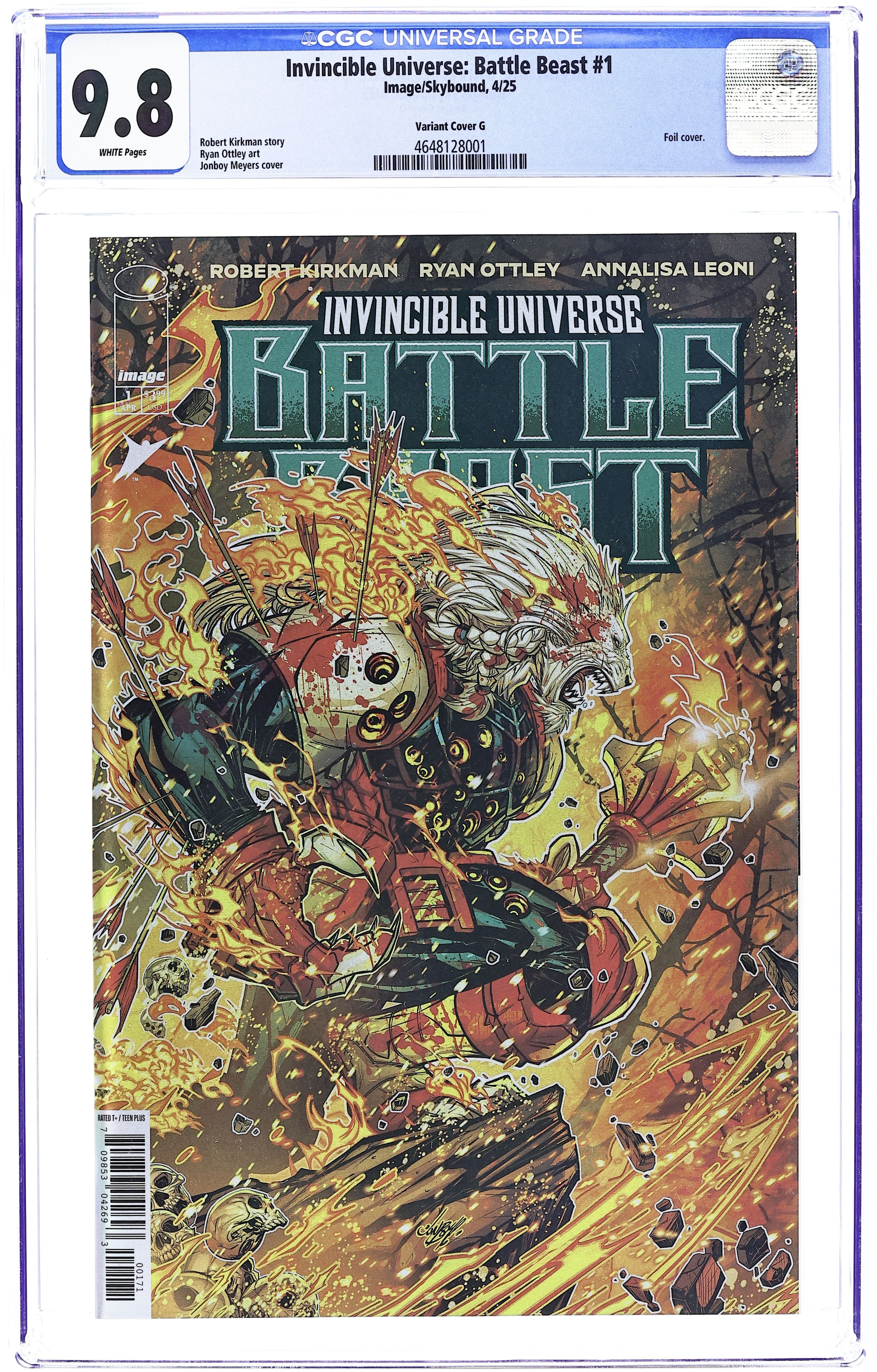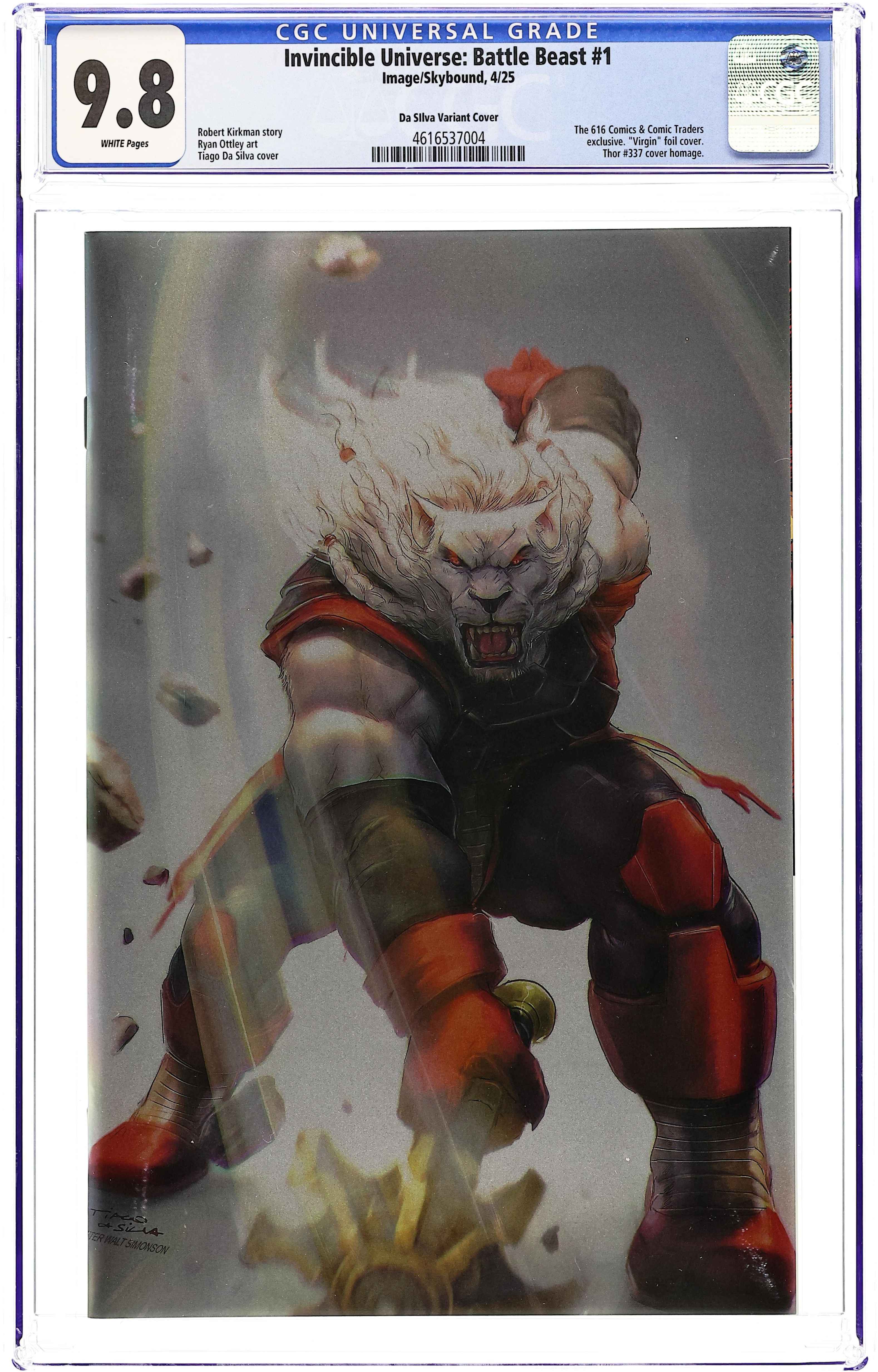 The 616 Comics and Comic Traders Exclusive Foil Edition Virgin Cover by Tiago Da Silva. Written by Robert Kirkman. Art by Ryan Ottley, Annalisa Leoni. SERIES PREMIERE THE BEST NEW (NOT QUITE A) SUPERHERO SERIES IN THE UNIVERSE! Cursed with an unquenchable thirst for violence, BATTLE BEAST searches the universe for the one warrior mightier than him-and a glorious death, his only reward. But even in a universe of mighty Viltrumites like Invincible and Omni-Man, it seems that no one may be able to stop the galaxy's deadliest warrior...unless he does the unthinkable. Superstars ROBERT KIRKMAN and RYAN OTTLEY present the most demanded** INVINCIBLE** story of all time, revealing the secret story of Battle Beast that's perfect for any long-time fan (no spoilers!) and new readers alike. 40 pages, full color. Rated T+