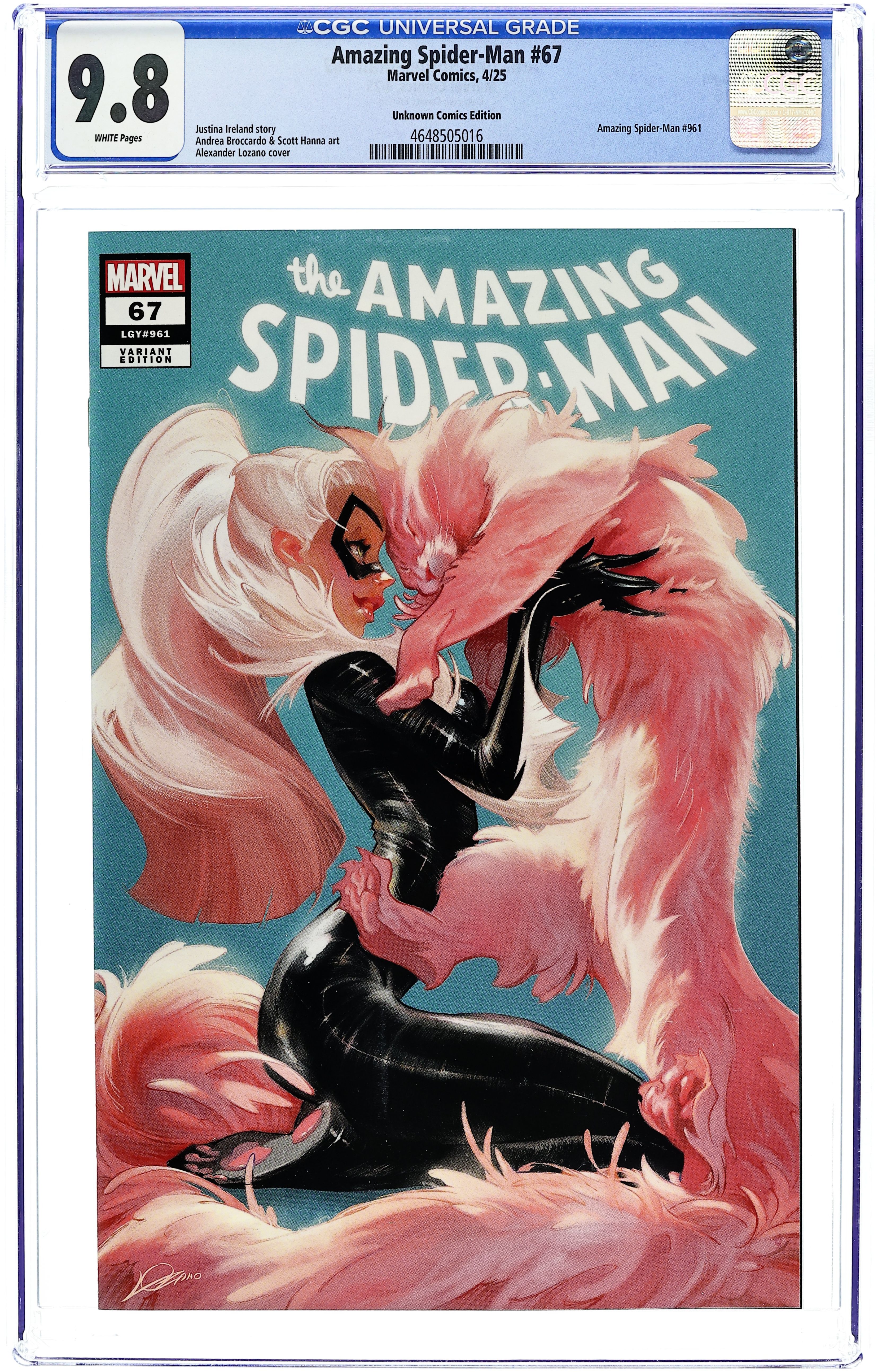 Unknown Comic Books Exclusive Variant Cover by Alexander Lozano. Written by Justina Ireland. Art by Andrea Broccardo. THE 8 DEATHS OF SPIDER-MAN CONTINUES! With his patron, Cyttorak, attacking the world, Juggernaut won't just sit aside. But he's not a solo act… THE X-MEN GET INVOLVED TO HELP SPIDER-MAN SAVE THE WORLD! 32 pages, full color. Rated T Cover price $4.99.