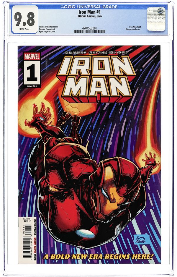 Foil Cover. (W) Joshua Williamson (A) Carmen Carnero (CA) Declan Shalvey The unapologetic Iron Man is a once-in-a-lifetime hero - but the beating heart behind the armor is a once-in-a-century genius. Years ago, Tony Stark was knocking on death's door, so he created the Iron Man armor to survive! What happens the next time death comes calling? What weapon does he create then? What if…someone else creates it first? These questions have haunted Tony for years, a ticking time bomb inside of him waiting to explode. Femme fatale Madame Masque has also asked these questions, and with the power of Advanced Idea Mechanics behind her…she's ready to create the next great weapon. Welcome superstar JOSHUA WILLIAMSON as he makes his powerful return to the hallowed halls of Marvel, taking the reins of the Golden Avenger with Legacy Stormbreaker CARMEN CARNERO! This is classic super-hero storytelling in the MIGHTY MARVEL MANNER, just how you like it! 40 pages, rated T+, full color Cover price $5.99.