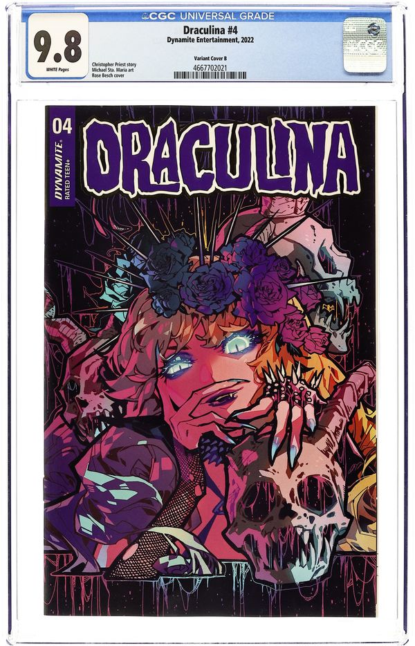 Written by Christopher Priest. Art by Michael Sta. Maria. Cover by Rose Besch. When the demon Belial tips off the jilted lover of their arranged marriage, Draculina finds herself hunted by the interdimensional 'Reality Merchant' Hesiod, who punishes Draculina by altering reality to reverse the fortunes of Draculina and her young alt-self Katie, granting the power (and wings!) of the Vampiri to the preteen while leaving Draculina confronted by an unwanted and fragile humanity, and at the mercy of her enemies! 32 pages, full color. Rated T+ Cover price $3.99.