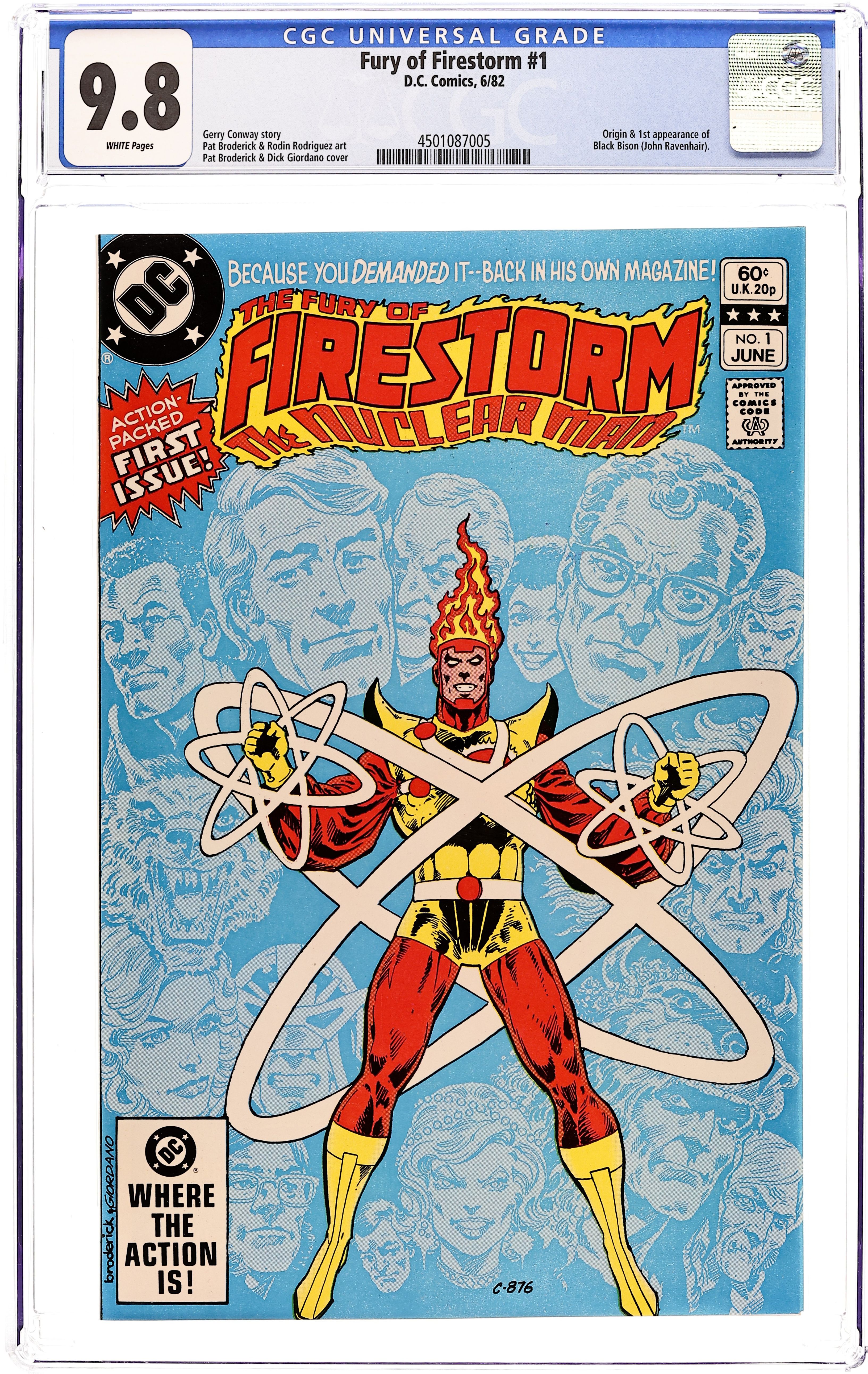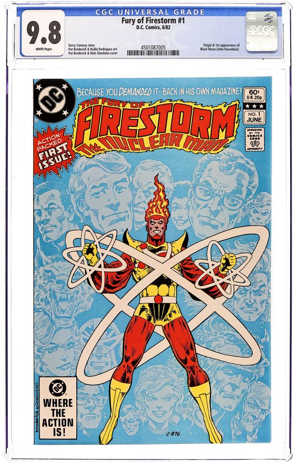 Newsstand Edition. Script by Gerry Conway, pencils by Pat Broderick, inks by Rodin Rodriguez. Broderick/Dick Giordano cover. Firestorm must contend with Black Bison, shaman of the Bison Cult, at the New York Museum of Natural History in "Day Of The Bison". Part 1 of 2, continued next issue. Cover price $0.60.