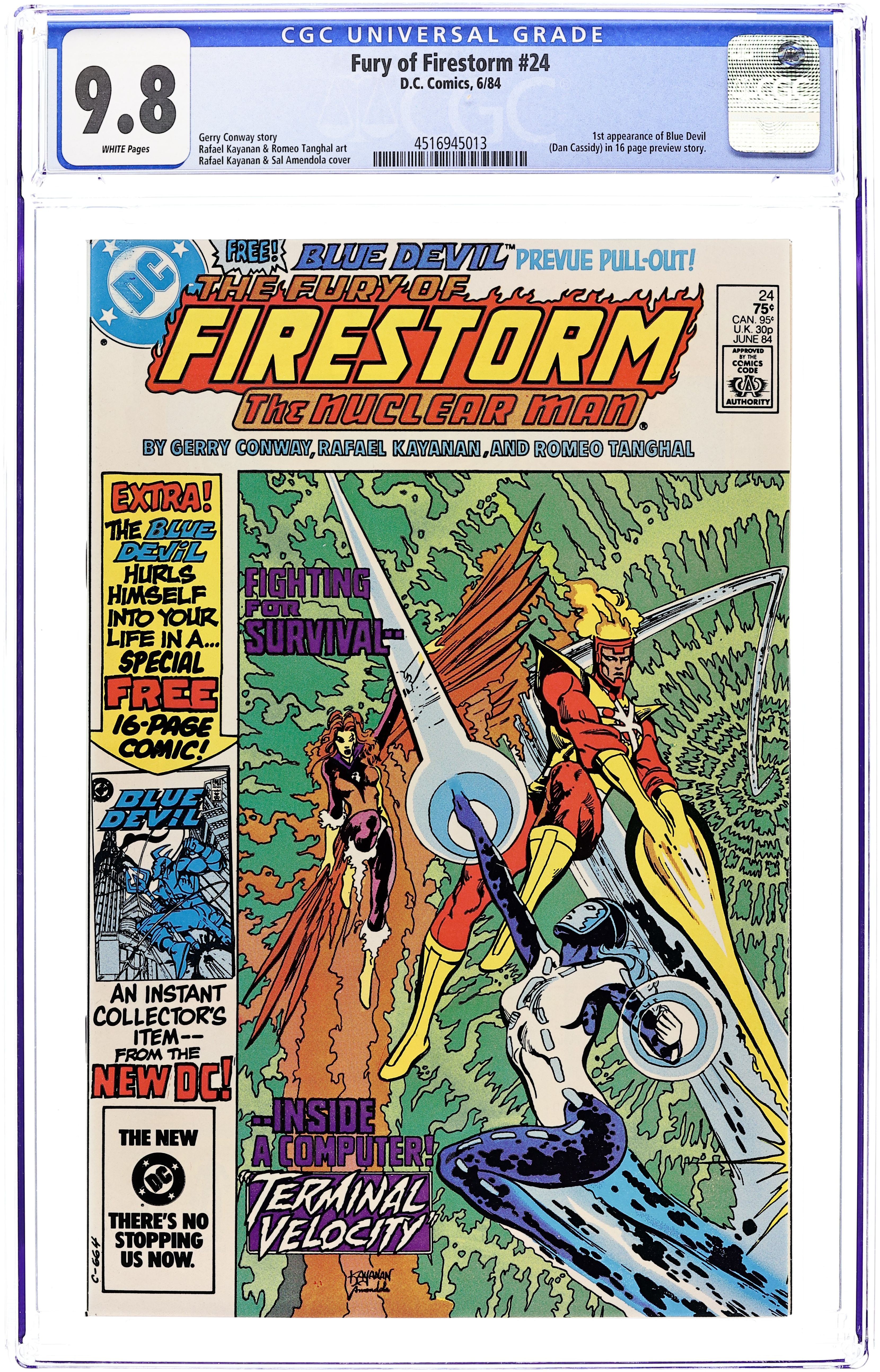 Canadian edition with $.95 cover price. First appearance of Blue Devil. Firestorm and Firehawk try to protect the woman being targeted by brother/sister duo Bug and Byte in "Terminal Velocity". Part 2 of 2, continued from the previous issue. Script by Gerry Conway, plot by Carla Conway, pencils by Rafael Kayanan, inks by Romeo Tanghal. 1-page pin-up by Kayanan and Tanghal. Bonus 16-page insert: Blue Devil is introduced in a tale by Gary Cohn, Dan Mishkin, Paris Cullins and Pablo Marcos. Kayanan/Sal Amendola cover. Cover price $0.95.