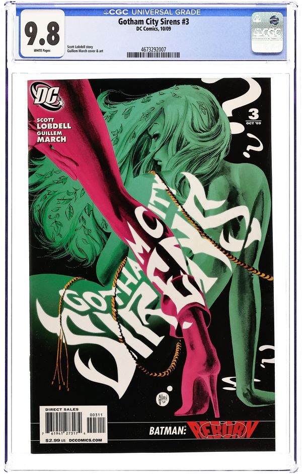 Written by Scott Lobdell. Art and cover by Guillem March. With their uneasy alliance in place, the sirens encounter trouble in the form of the mysteriously returned Bruce Wayne. He's dazzling, he's dangerous and he's got his sights set on Harley Quinn! Has romance sparked between these two long-time enemies - or is Wayne playing a more sinister game? 32 pages, full color. Cover price $2.99.
