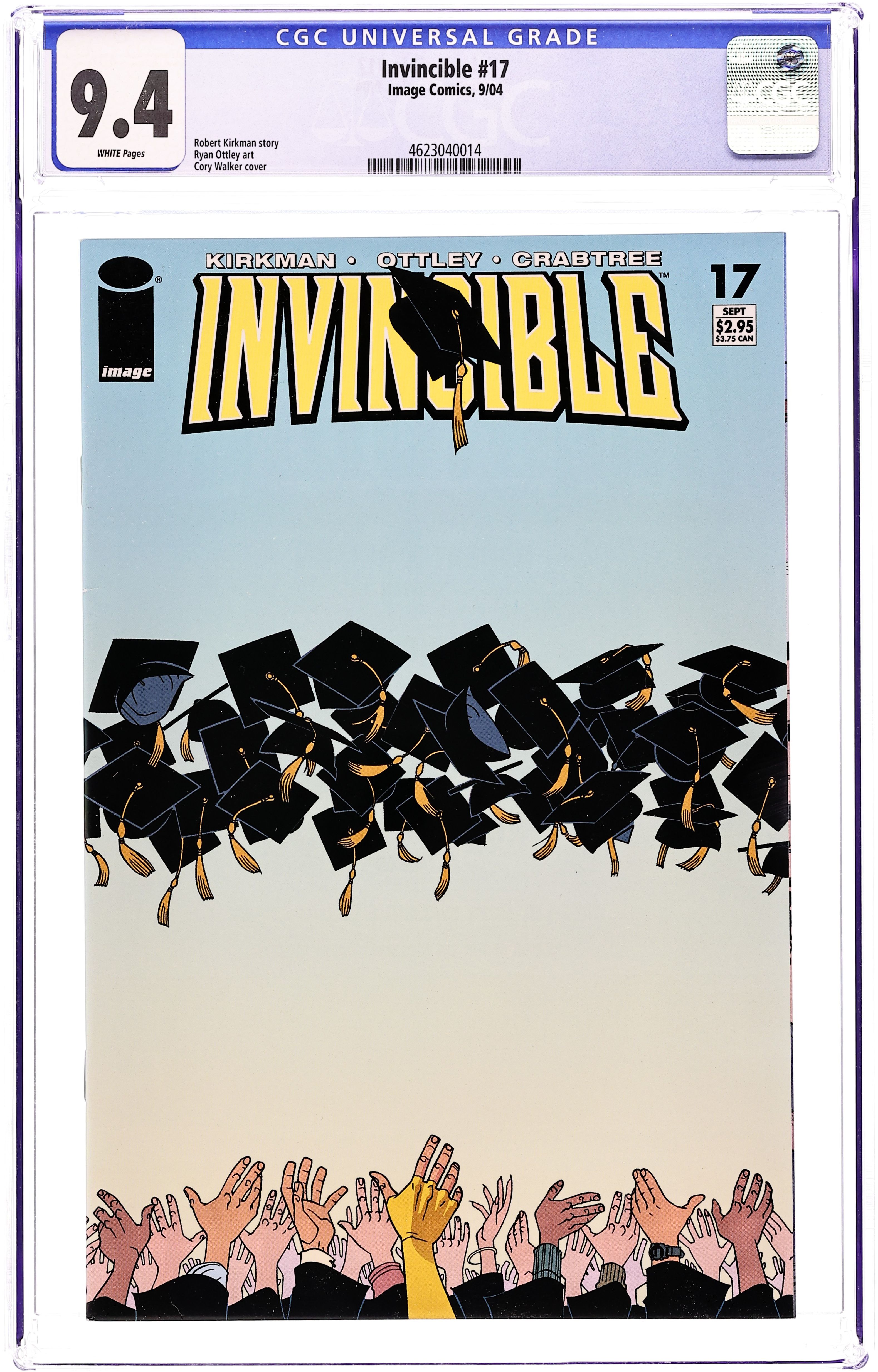 09.15/$2.95 monthly ongoing series full color/32 pages written by ROBERT KIRKMAN art by RYAN OTTLEY cover by CORY WALKER & BILL CRABTREE CONCEPT: Mark Grayson is just like everyone else his age, except that his father is the most powerful superhero on the planet. And now he's begun to inherit his father's powers. It all sounds okay at first, but how do you follow in your father's footsteps when you know you will never live up to his standards? THIS ISSUE: Old doors close as new ones open. Mark Grayson, AKA Invincible, has reached the end of his high school years. Watch as our hero dons that goofy-looking cap and gown and hope some big super-villain doesn't crash his graduation ceremony. Then again, what are the chances of THAT happening? Cover price $2.95.
