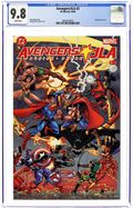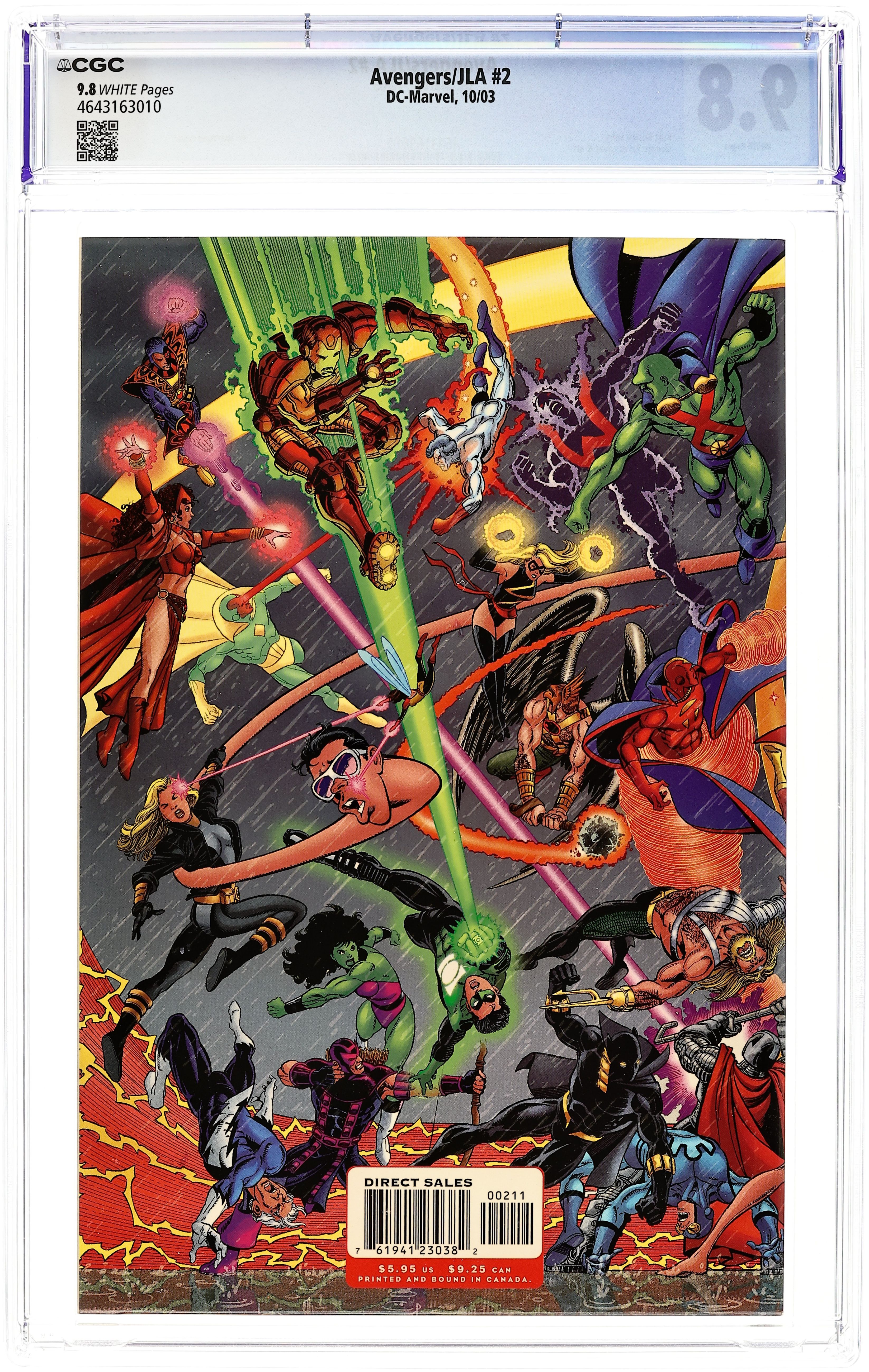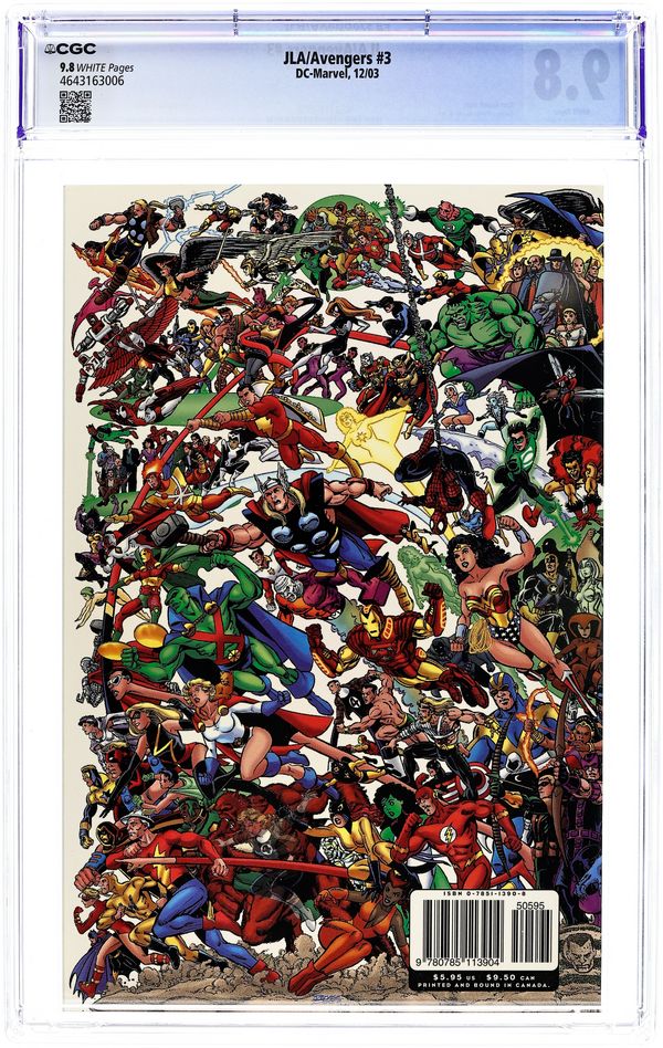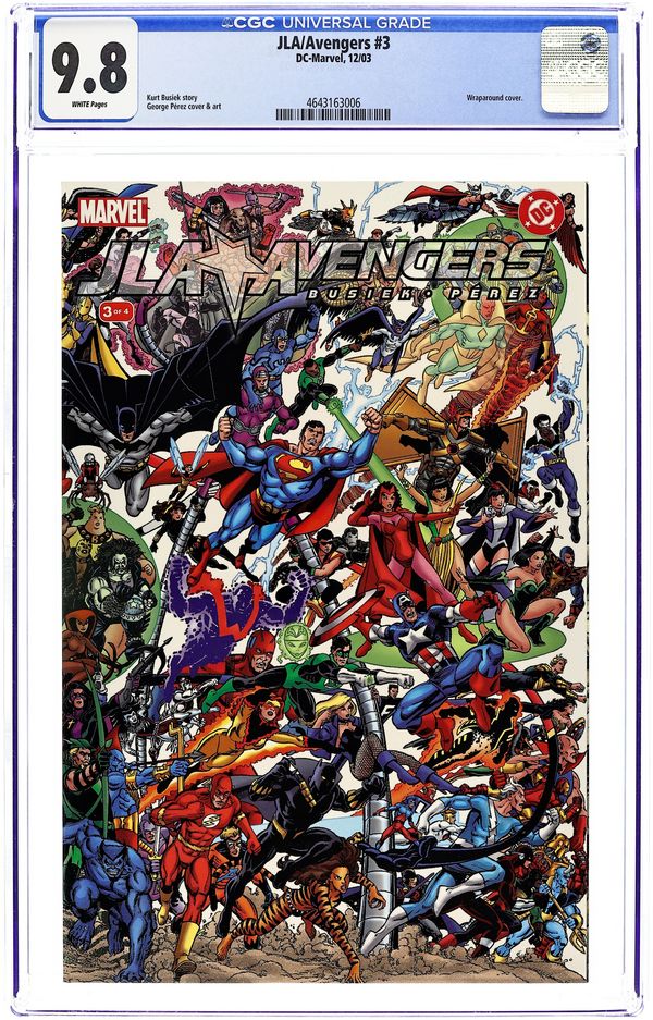 Written by KURT BUSIEK; Wraparound cover & art by GEORGE PÉREZ THE EVENT 20 YEARS IN THE MAKING!·WITH APPEARANCES BY EVERY AVENGER & JLA MEMBER ... EVER! THE WAIT IS OVER! The most eagerly anticipated comic book crossover of all time has finally arrived, with alternating Prestige Format issues by Marvel & DC Comics! What cataclysmic threat could endanger two universes - and dwarf the combined power of both Earth's Mightiest Heroes and the World's Greatest Super-Heroes? The world finally learns the answer in September 2003! 48 PGS./PRESTIGE FORMAT/MARVEL PG...$5.95 UPC: 5960605369-00111 Cover price $5.95.