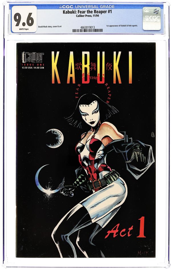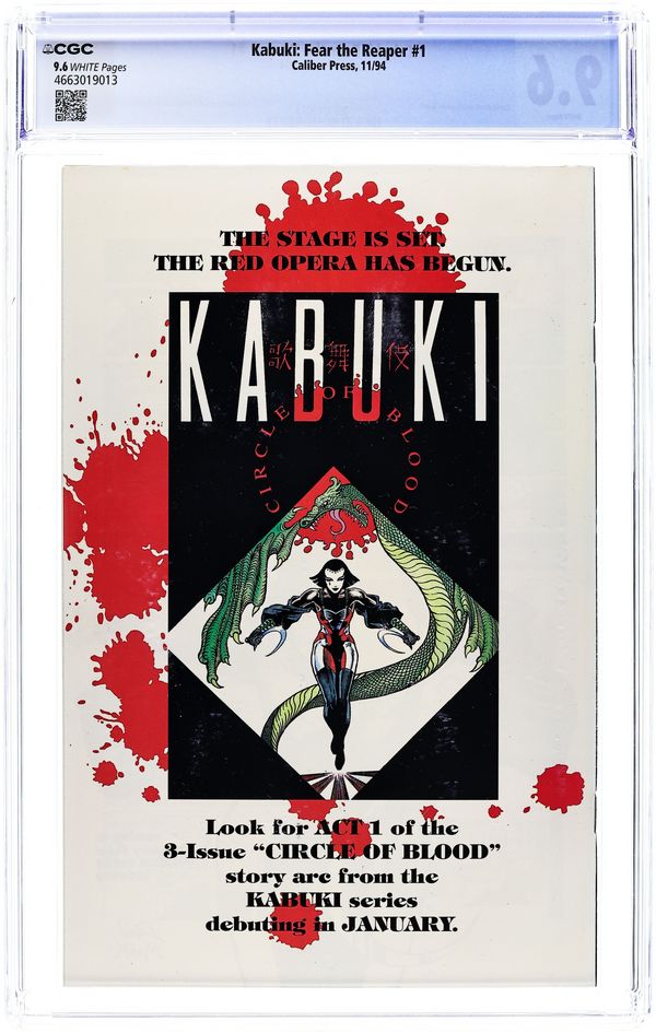 Story, art and cover by David Mack. The one-shot that launched Macks acclaimed Kabuki series. In an alternate-reality Japan, the masked female assassin known as Kabuki goes after a media mogul with connections to a Yakuza leader. Includes a Kabuki sketchbook by Mack. Also known as Kabuki: Fear the Reaper. Followed by Kabuki: Dance of Death and the Circle of Blood miniseries. 48 pages, B&W. Mature readers. Cover price $3.50.
