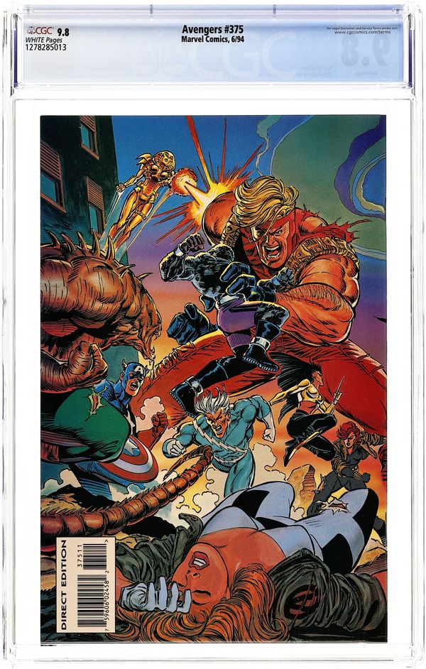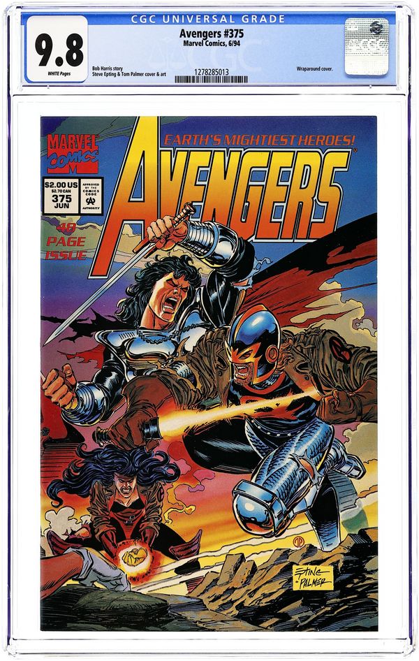 Collector's Edition. The Gatherers Saga: Part 18 of 18 - "The Last Gathering" Part 4 of 4. Double-size issue. Guest-starring Thena and Sprite. Script by Bob Harras. Pencils by Steve Epting. Inks by Tom Palmer. Wraparound Cover by Steve Epting and Tom Palmer. Finally, it's here! The senses-shattering conclusion to the epic Gatherers storyline! In the heart of New York City, Earth's Mightiest Heroes lay it all on the line to derail Proctor's diabolic plan to destroy the prime reality! With his eternal victory drawing near, Proctor siphons the powers of Sersi and Ute (the aging Watcher) and creates an energy vortex to collapse all realities! On countless alternative Earths, Proctor and his Gatherers have always triumphed over the Avengers! But on this Earth, the relationships among Dane, Sersi, Crystal, and Pietro are different and unique! Will the power of love be the difference between life and death for all existence? A sensational story with a poignant ending! Final appearance of Proctor. Second story: "A Bigger Man Than I..." Script by Benjamin Raab. Pencils by Yancey Labat. Inks by Maria Beccari. Hank Pym undergoes a virtual reality psychological evaluation! Giant-Man's trip into his subconscious should not necessarily be dangerous, but the virtual ants have other ideas! Third feature: One-page pin-up of Captain America by Tom Palmer. Fourth feature: One-page pin-up of Deathcry by Steve Epting. Avengers Lineup: Black Knight, Black Widow, Captain America, Crystal, Giant-Man, Hercules, Quicksilver, Sersi, and Thunderstrike. (Notes: The Gatherers storyline revitalized the Avengers title in the first half of the 1990's. The Black Knight and Sersi return in Ultraforce (1994 Malibu) 8 published in May 1995. The original Avengers Mansion is restored after the battle. This issue includes a pullout poster of the Avengers by Steve Epting and Tom Palmer. This issue also completes Steve Epting's outstanding run as the penciler of the Avengers series.) 52 pages. Cover price $2.50.