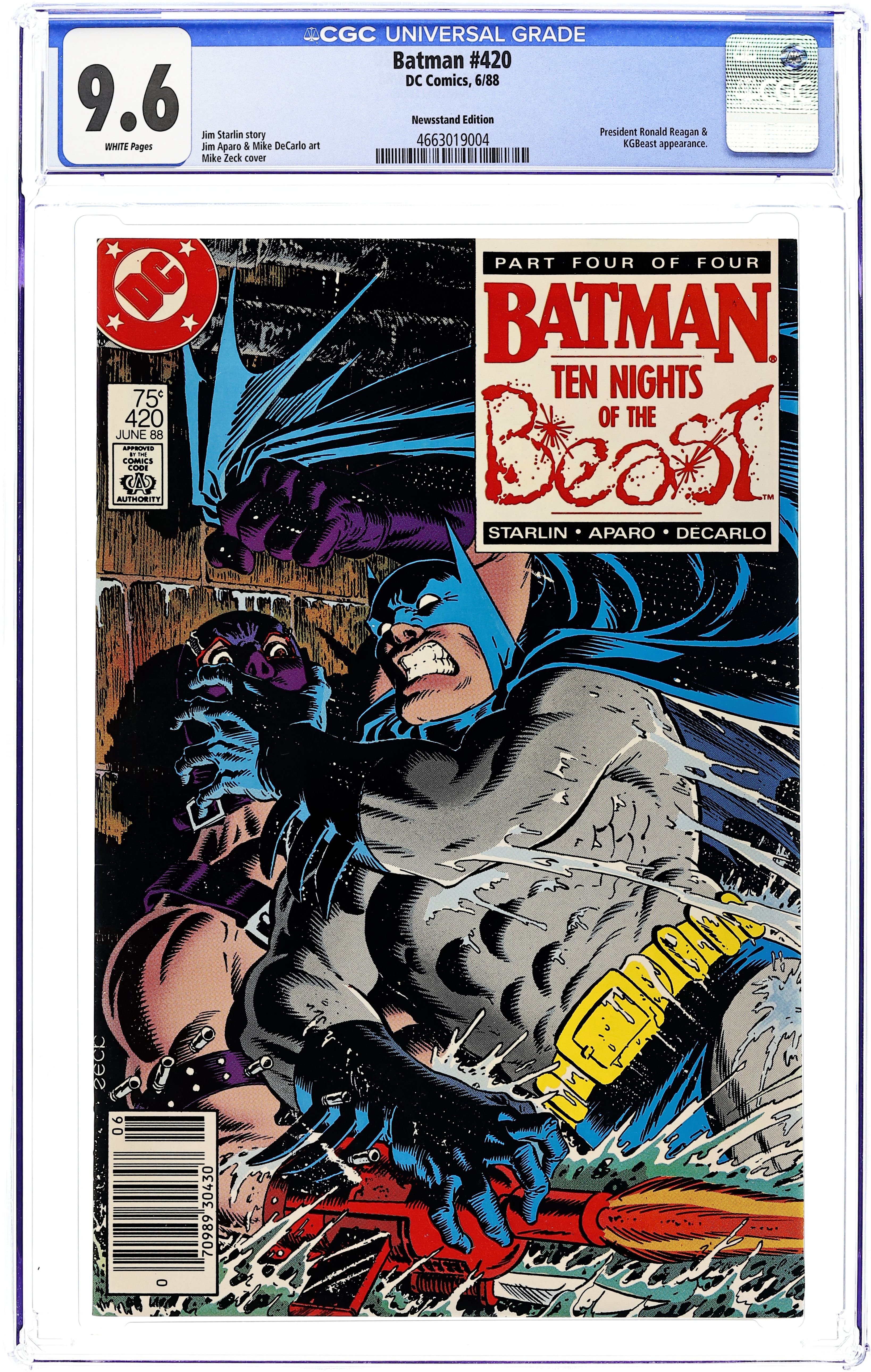 First Printing. Direct Edition. Batman tracks the KGBeast into the sewers, and tries his best to prevent the assassination of President Ronald Reagan in "Ten Nights Of The Beast!" Part 4 of 4, continued from the previous issue. Script by Jim Starlin, pencils by Jim Aparo, inks by Mike DeCarlo. Mike Zeck cover. NOTE: Most issues from 397-432 were reprinted in 1989 and sold in multipacks. These 2nd and 3rd prints have back cover ads dated 1989. 36 Pages, Full Color. Cover price $0.75.