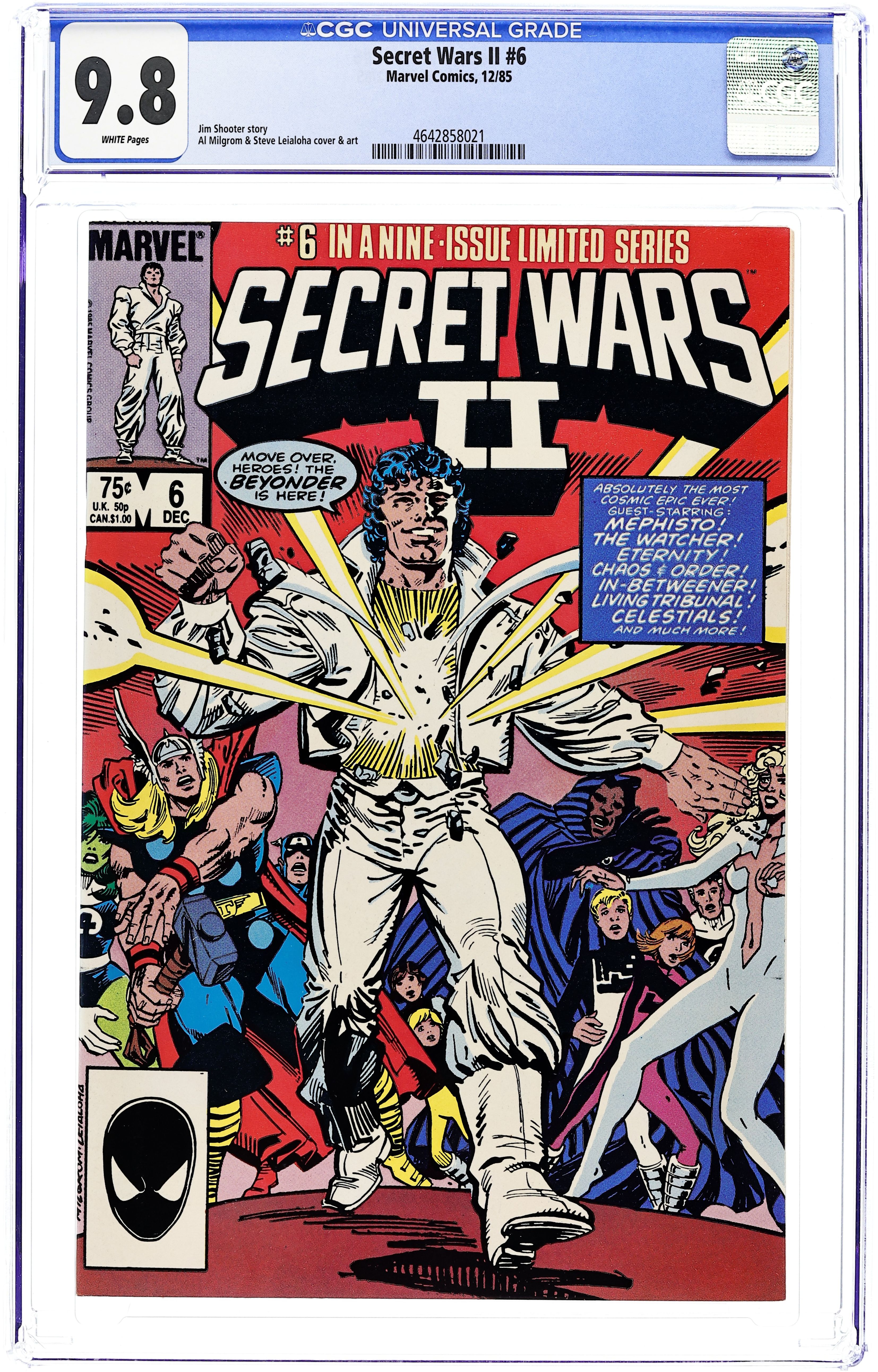 Part 9 of 9. "God in Man, Man in God!" Story by Jim Shooter. Art by Al Milgrom and Steve Leialoha. This is it, the final battle between the Beyonder and the heroes of the Marvel Universe. However, a titanic battle of this magnitude could destroy the very fabric of reality. Right or wrong, good or bad, the tragic ending to this one will touch everyone. Featuring the Beyonder vs. the Molecule Man, Avengers, Fantastic Four, Uncanny X-Men, Spider-Man, Hulk, West Coast Avengers, and the Silver Surfer.